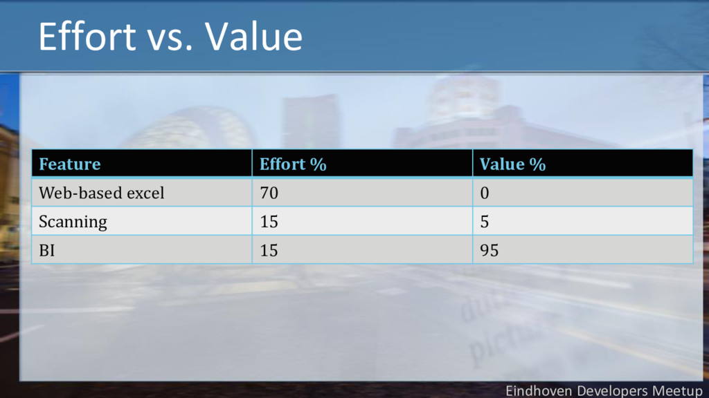 Effort vs. Value Eindhoven Developers Meetup Feature Effort % Value