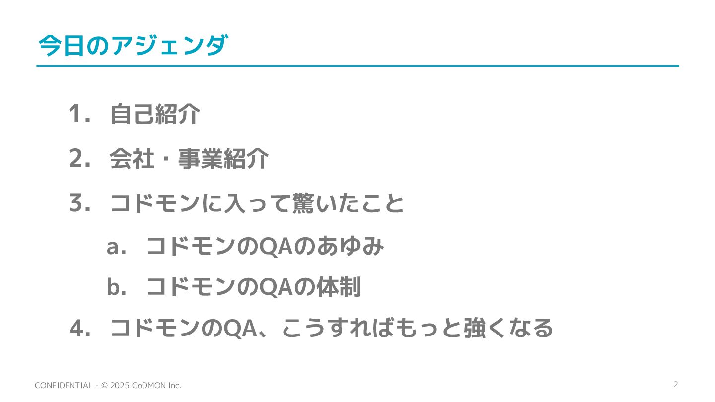 2. 会社・事業紹介 3. コドモンに入って驚いたこと a. コドモンのQAのあゆみ b. コドモンのQAの体制 4. コドモンのQA、こうすればもっと強くなる
