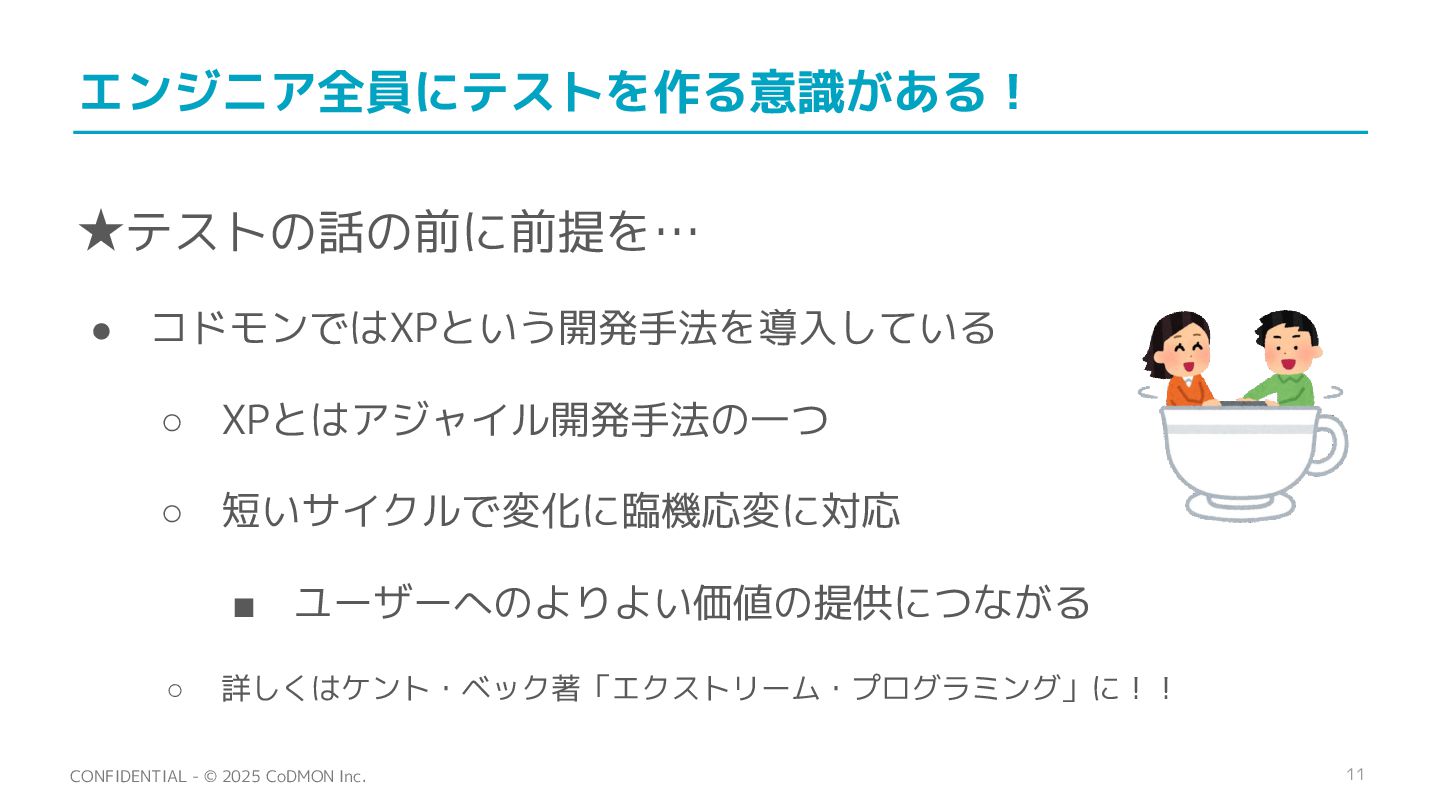 11 CONFIDENTIAL - © 2025 CoDMON Inc. エンジニア全員にテストを作る意識がある! • コドモンではXPという開発手法を導入している