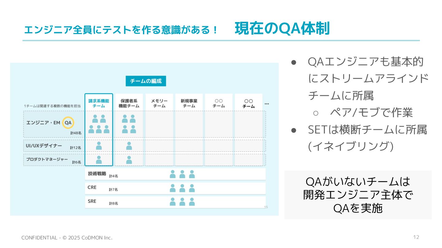 12 CONFIDENTIAL - © 2025 CoDMON Inc. エンジニア全員にテストを作る意識がある! 現在のQA体制 • QAエンジニアも基本的