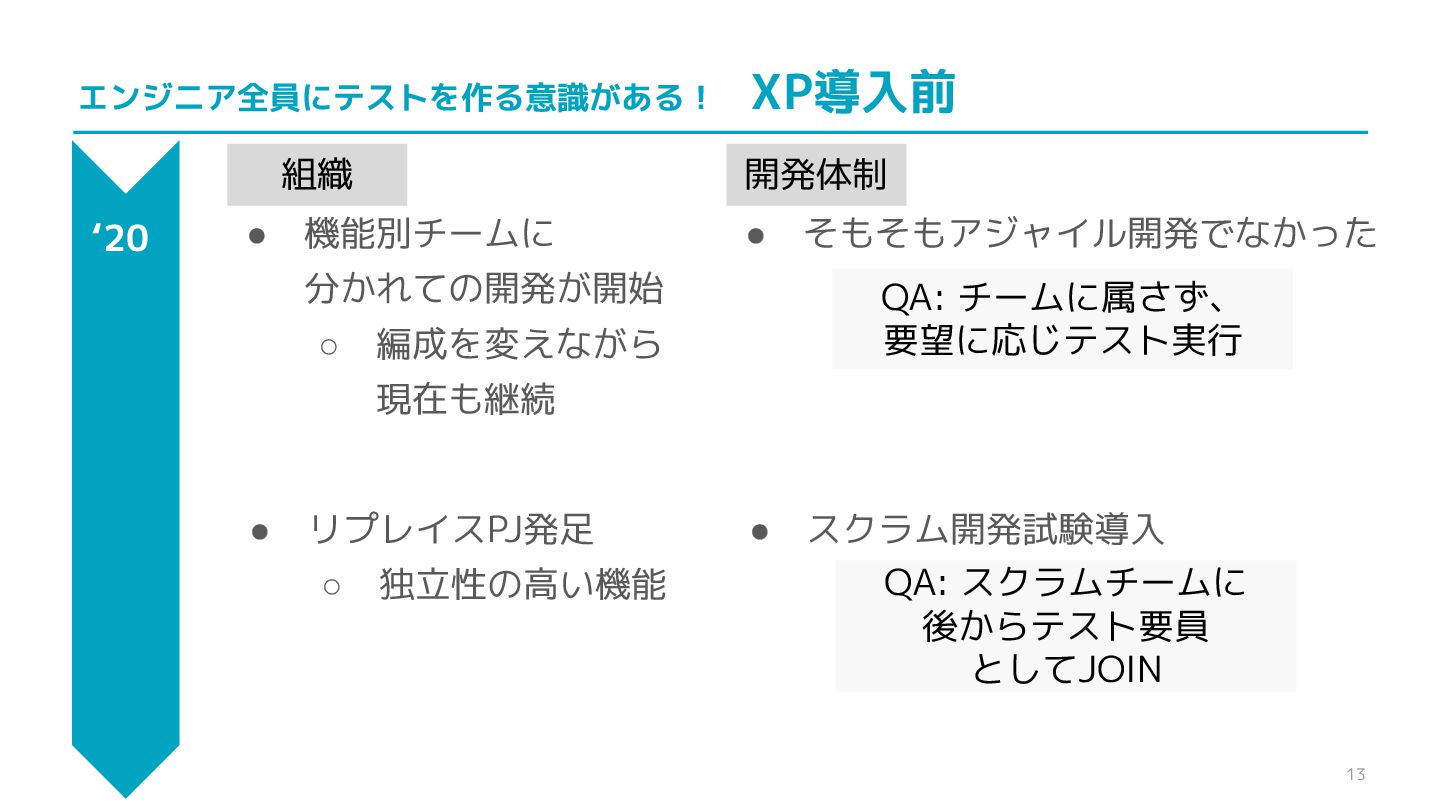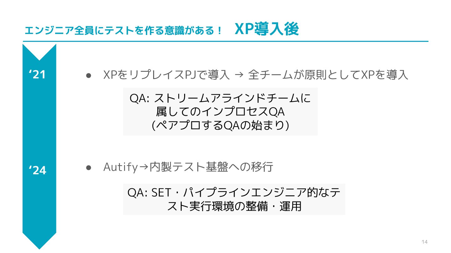 13 エンジニア全員にテストを作る意識がある! XP導入前 • そもそもアジャイル開発でなかった ‘20 開発体制 組織 • 機能別チームに 分かれての開発が開始