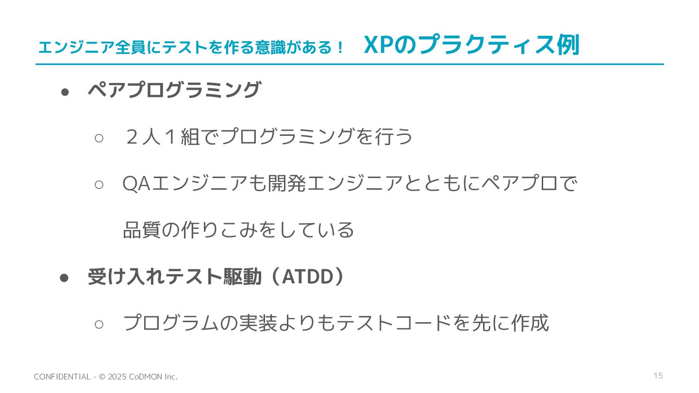 15 CONFIDENTIAL - © 2025 CoDMON Inc. エンジニア全員にテストを作る意識がある! XPのプラクティス例 • ペアプログラミング
