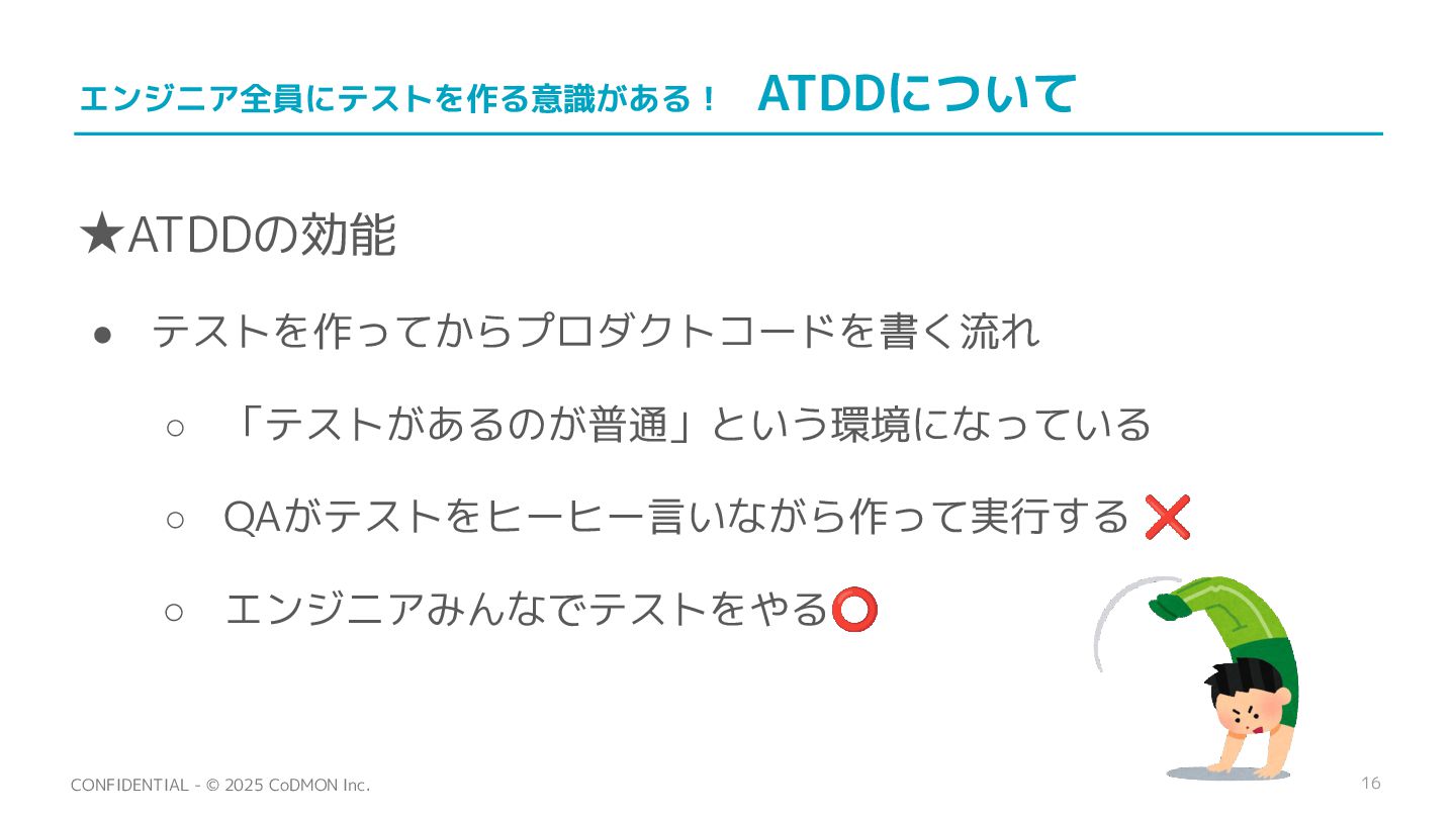 16 CONFIDENTIAL - © 2025 CoDMON Inc. エンジニア全員にテストを作る意識がある! ATDDについて • テストを作ってからプロダクトコードを書く流れ