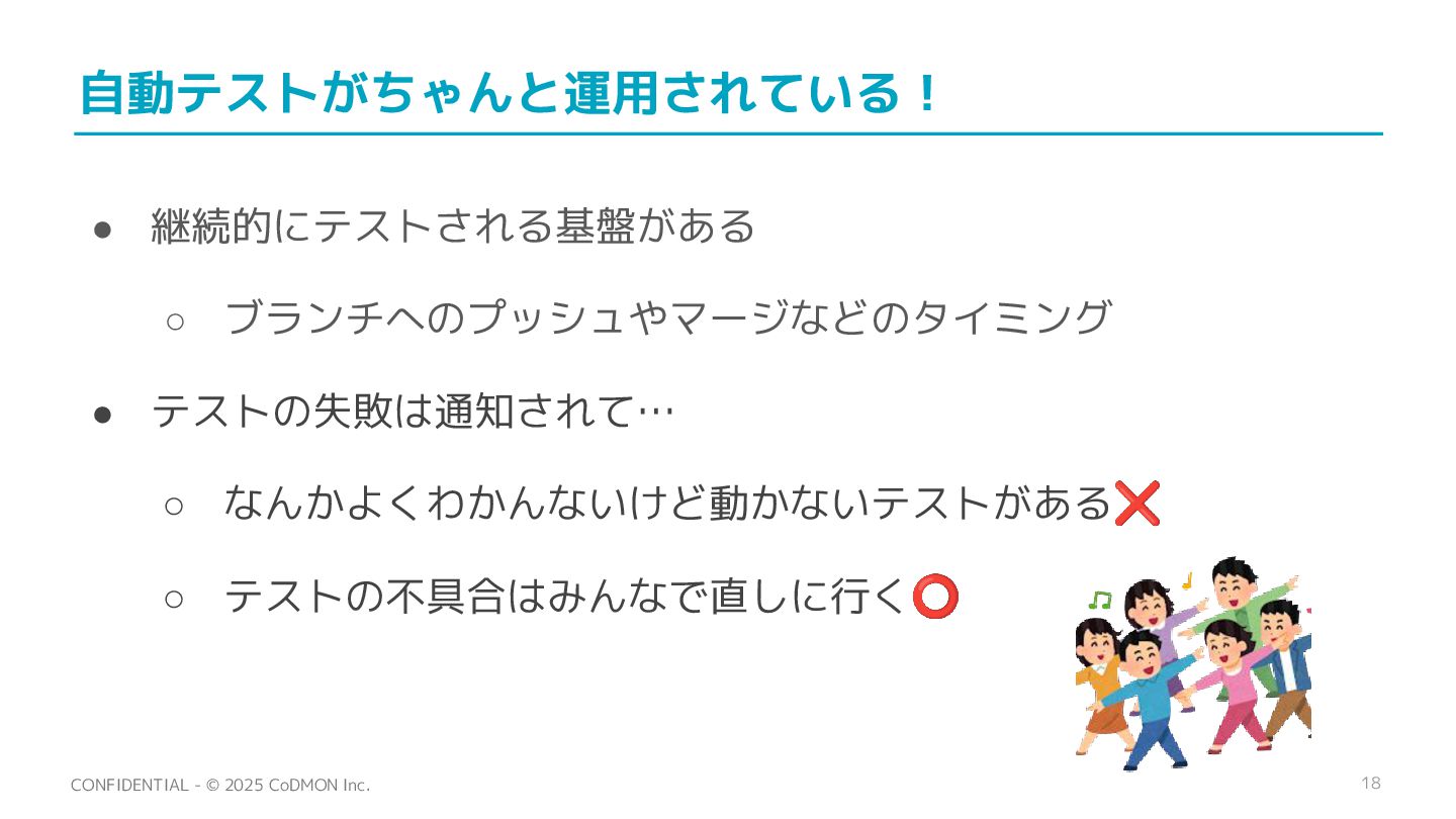 18 CONFIDENTIAL - © 2025 CoDMON Inc. 自動テストがちゃんと運用されている! • 継続的にテストされる基盤がある