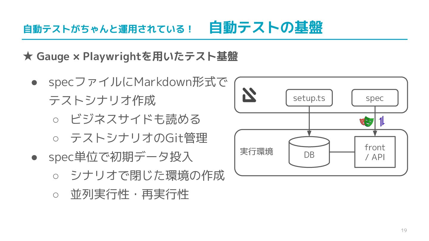 ビジネスサイドも読める ◦ テストシナリオのGit管理 • spec単位で初期データ投入 ◦ シナリオで閉じた環境の作成 ◦ 並列実行性・再実行性 setup.ts DB 実行環境 front / API spec