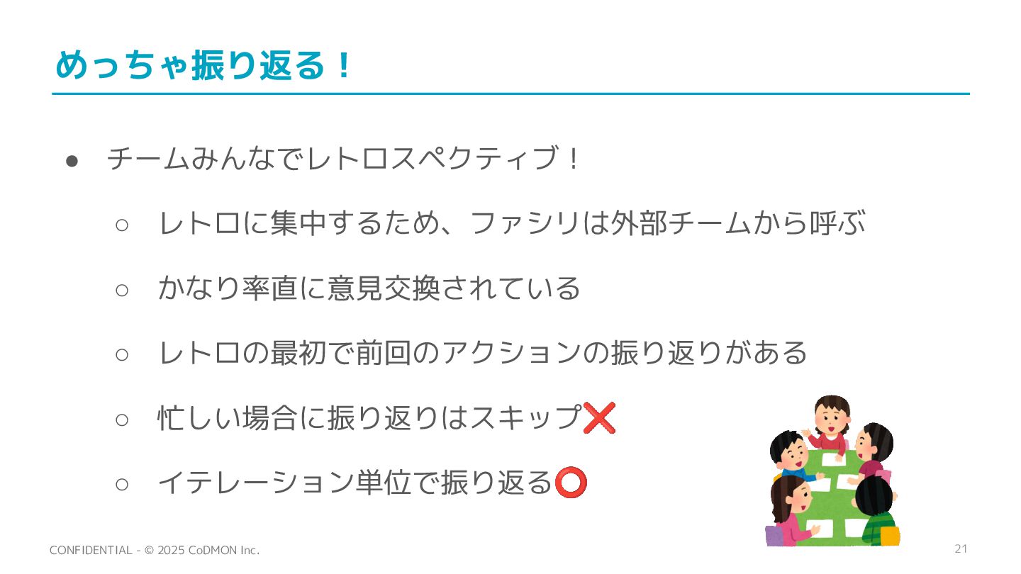 21 CONFIDENTIAL - © 2025 CoDMON Inc. めっちゃ振り返る! • チームみんなでレトロスペクティブ!