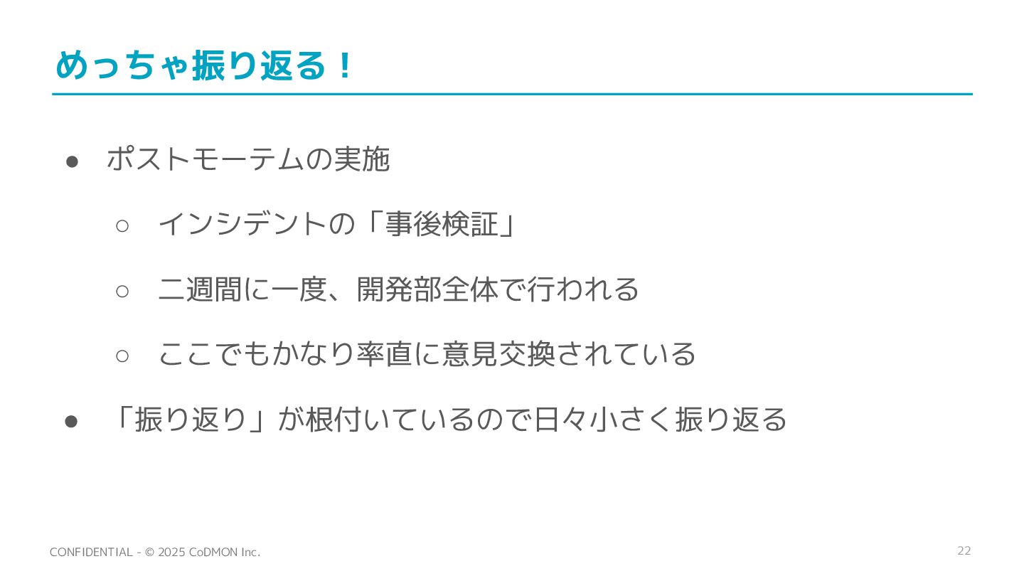 22 CONFIDENTIAL - © 2025 CoDMON Inc. めっちゃ振り返る! • ポストモーテムの実施