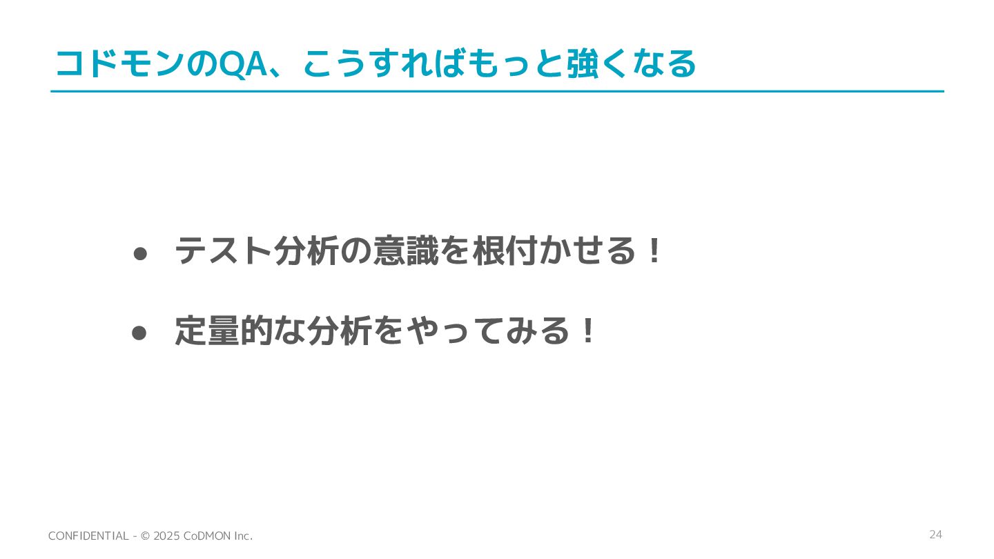 24 CONFIDENTIAL - © 2025 CoDMON Inc. コドモンのQA、こうすればもっと強くなる • テスト分析の意識を根付かせる!
