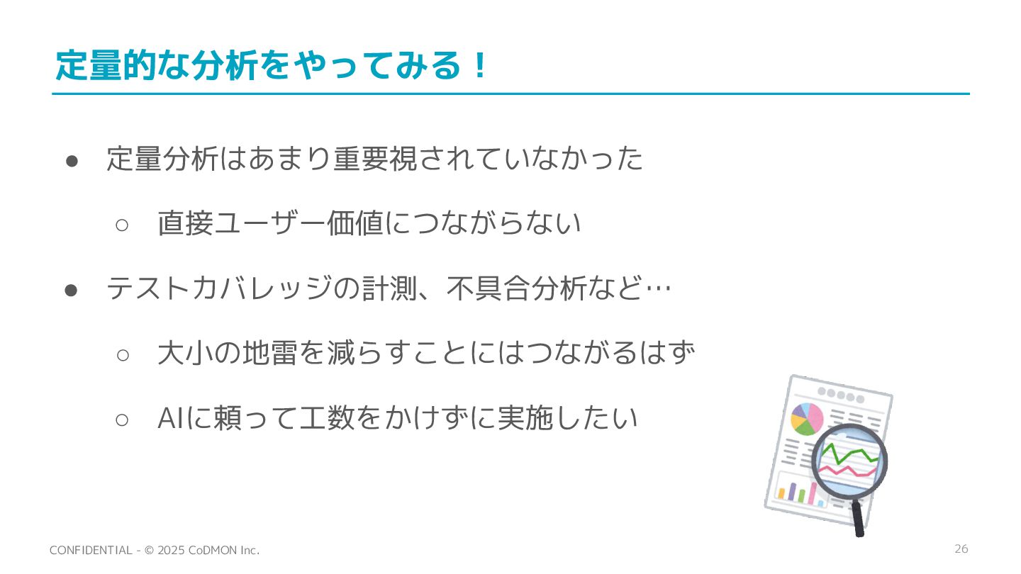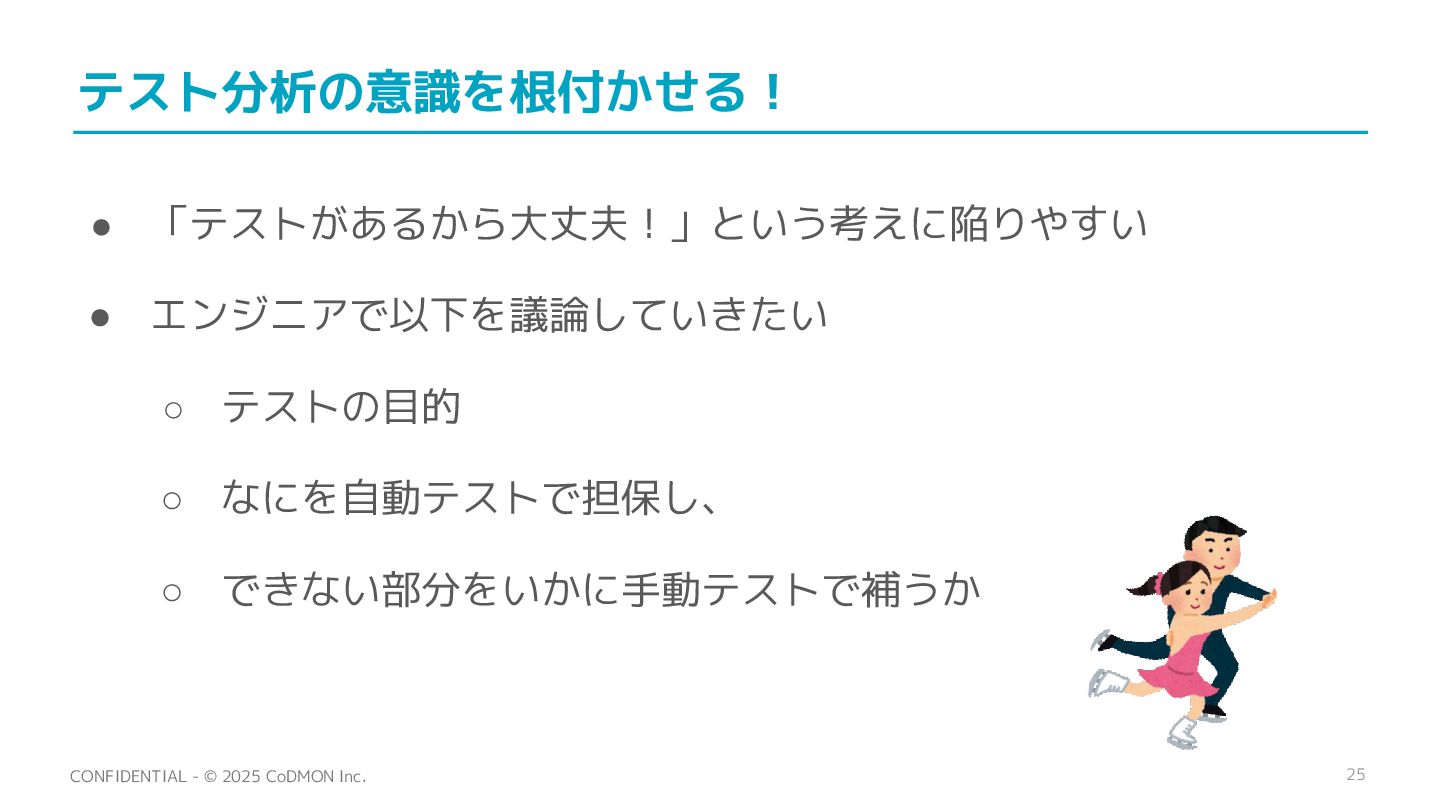 25 CONFIDENTIAL - © 2025 CoDMON Inc. テスト分析の意識を根付かせる! • 「テストがあるから大丈夫!」という考えに陥りやすい