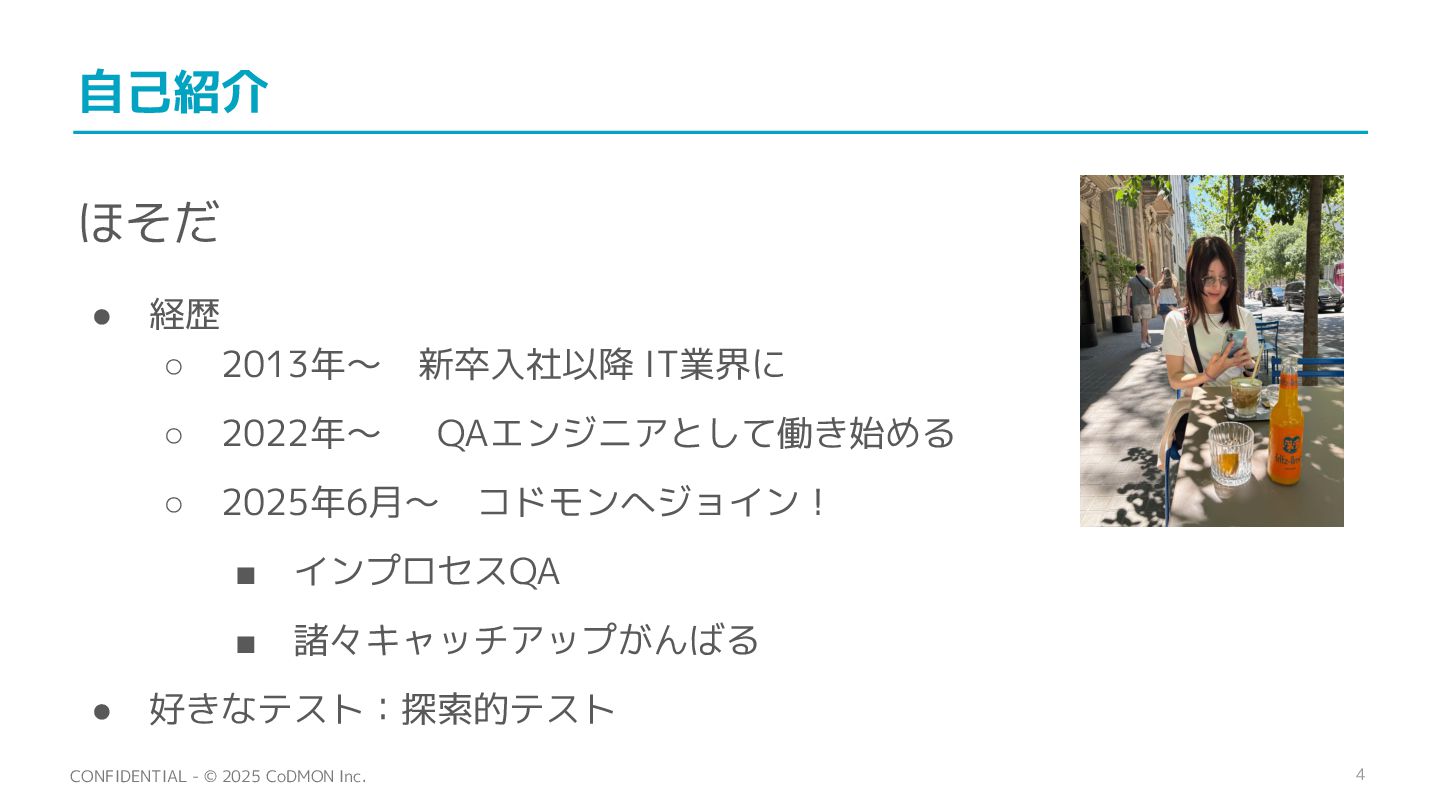 経歴 ◦ 2013年〜 新卒入社以降 IT業界に ◦ 2022年〜 QAエンジニアとして働き始める ◦ 2025年6月〜 コドモンへジョイン! ▪ インプロセスQA ▪ 諸々キャッチアップがんばる • 好きなテスト:探索的テスト