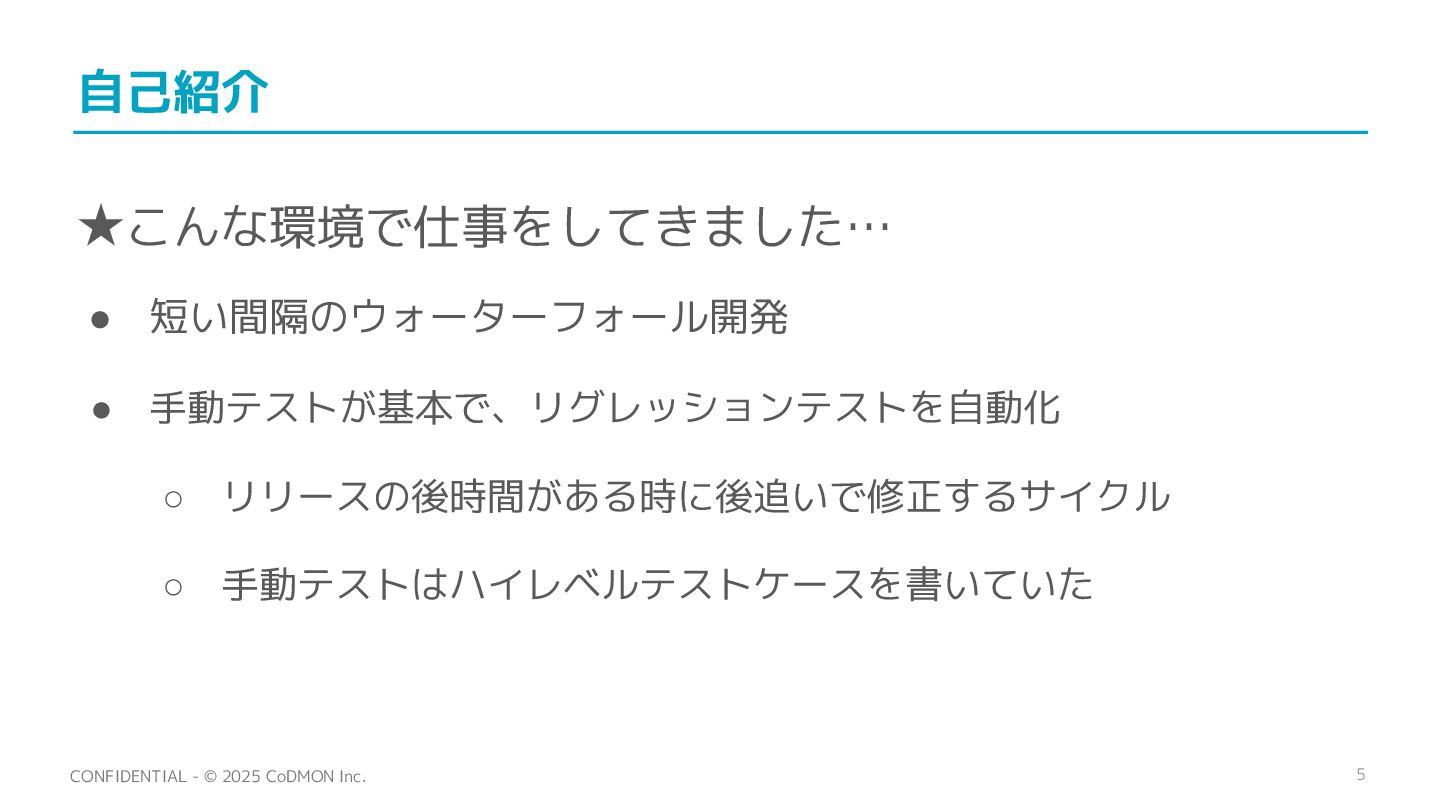 5 CONFIDENTIAL - © 2025 CoDMON Inc. 自己紹介 ★こんな環境で仕事をしてきました… •