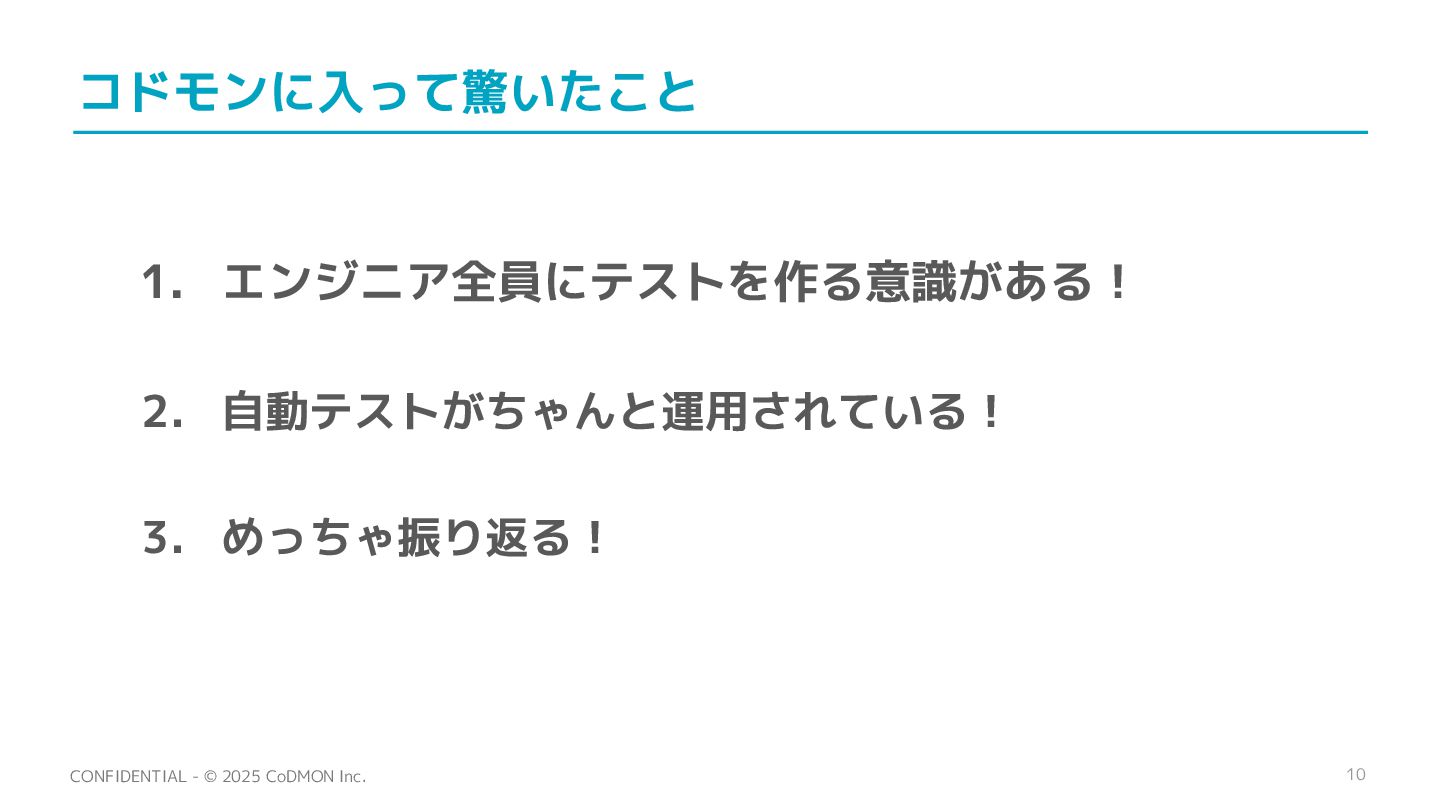 10 CONFIDENTIAL - © 2025 CoDMON Inc. コドモンに入って驚いたこと 1. エンジニア全員にテストを作る意識がある!