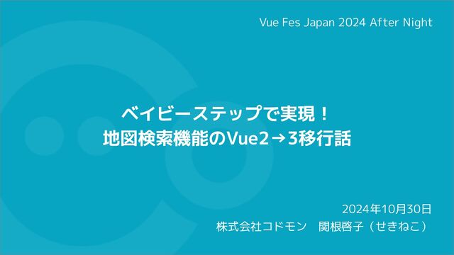 2024年10月30日 株式会社コドモン 関根啓子(せきねこ) ベイビーステップで実現! 地図検索機能のVue2→3移行話 Vue Fes Japan 2024 After Night