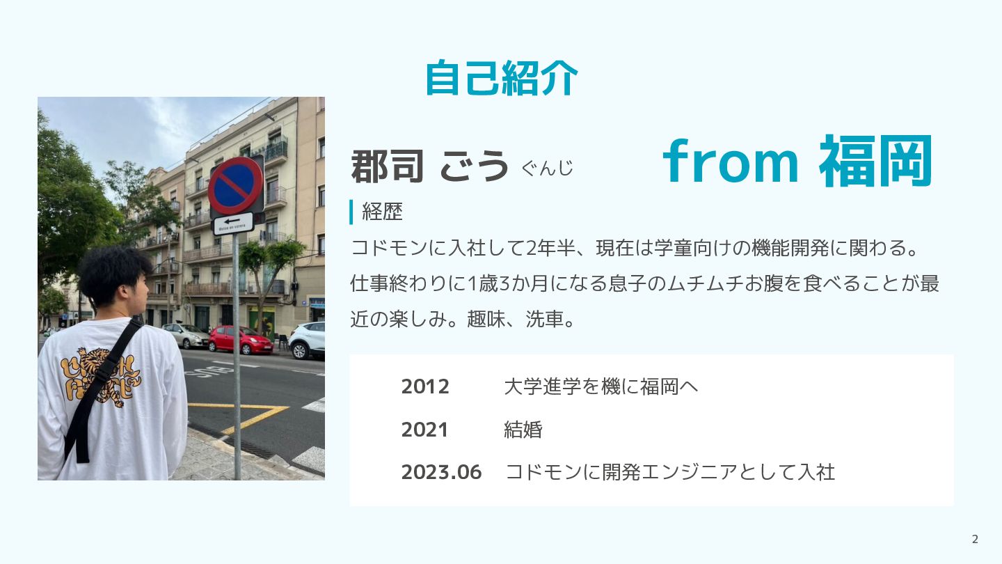 2 経歴 コドモンに入社して2年半、現在は学童向けの機能開発に関わる。 仕事終わりに1歳3か月になる息子のムチムチお腹を食べることが最 近の楽しみ。趣味、洗車。 自己紹介 郡司 ごう ぐんじ ごう 2012