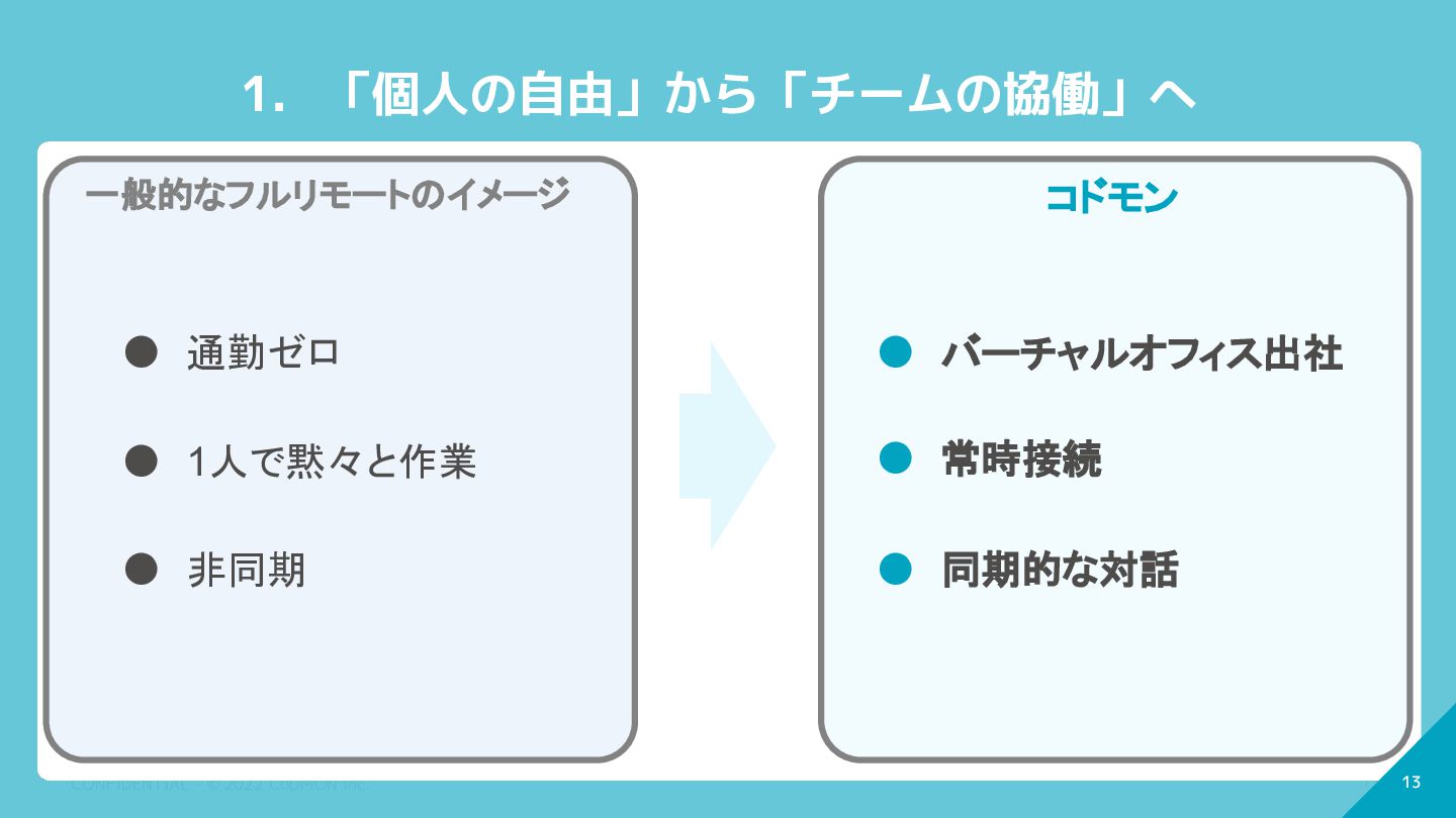 12 CONFIDENTIAL - © 2022 CoDMON Inc. 12 1. 「個人の自由」から「チームの協働」へ