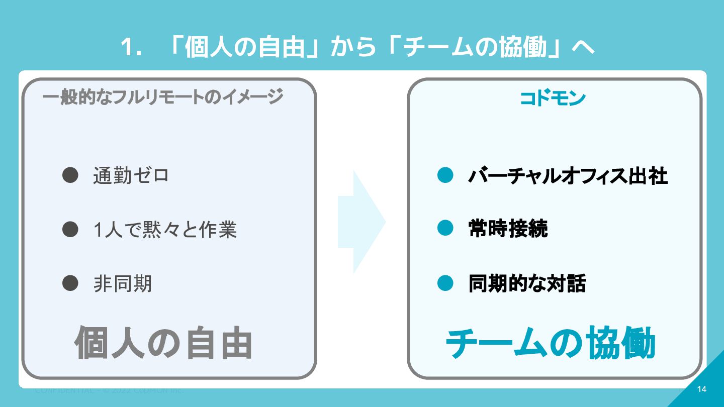 13 CONFIDENTIAL - © 2022 CoDMON Inc. 13 1. 「個人の自由」から「チームの協働」へ