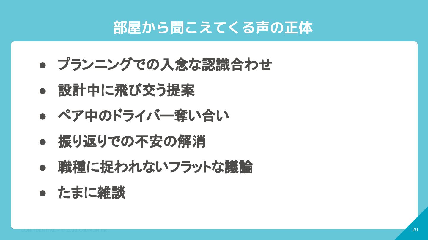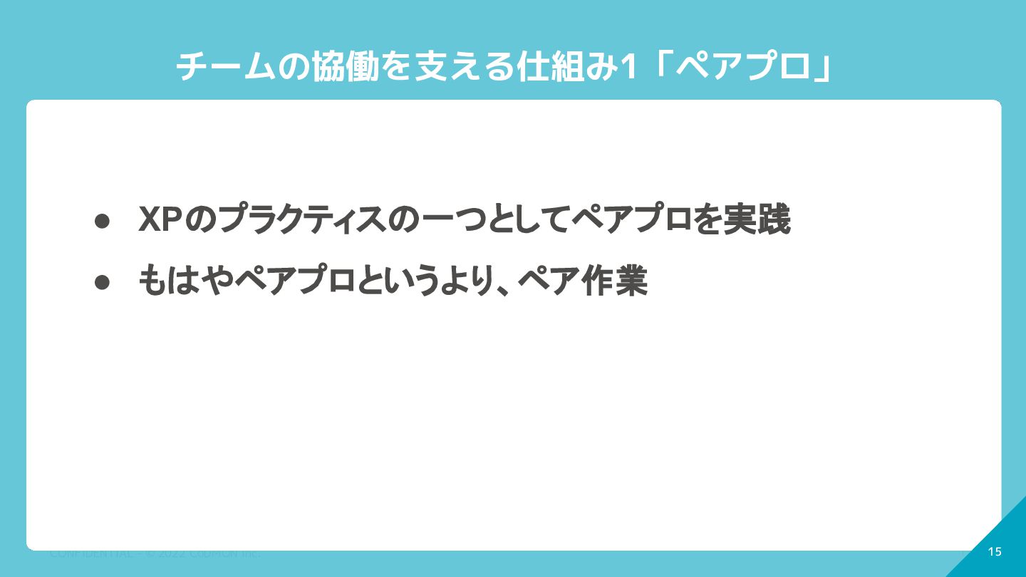 15 CONFIDENTIAL - © 2022 CoDMON Inc. 15 • XPのプラクティスの一つとしてペアプロを実践