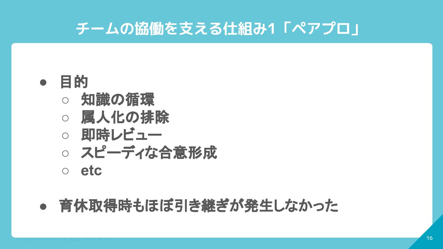 ◦ 知識の循環 ◦ 属人化の排除 ◦ 即時レビュー ◦ スピーディな合意形成 ◦ etc • 育休取得時もほぼ引き継ぎが発生しなかった チームの協働を支える仕組み1「ペアプロ」