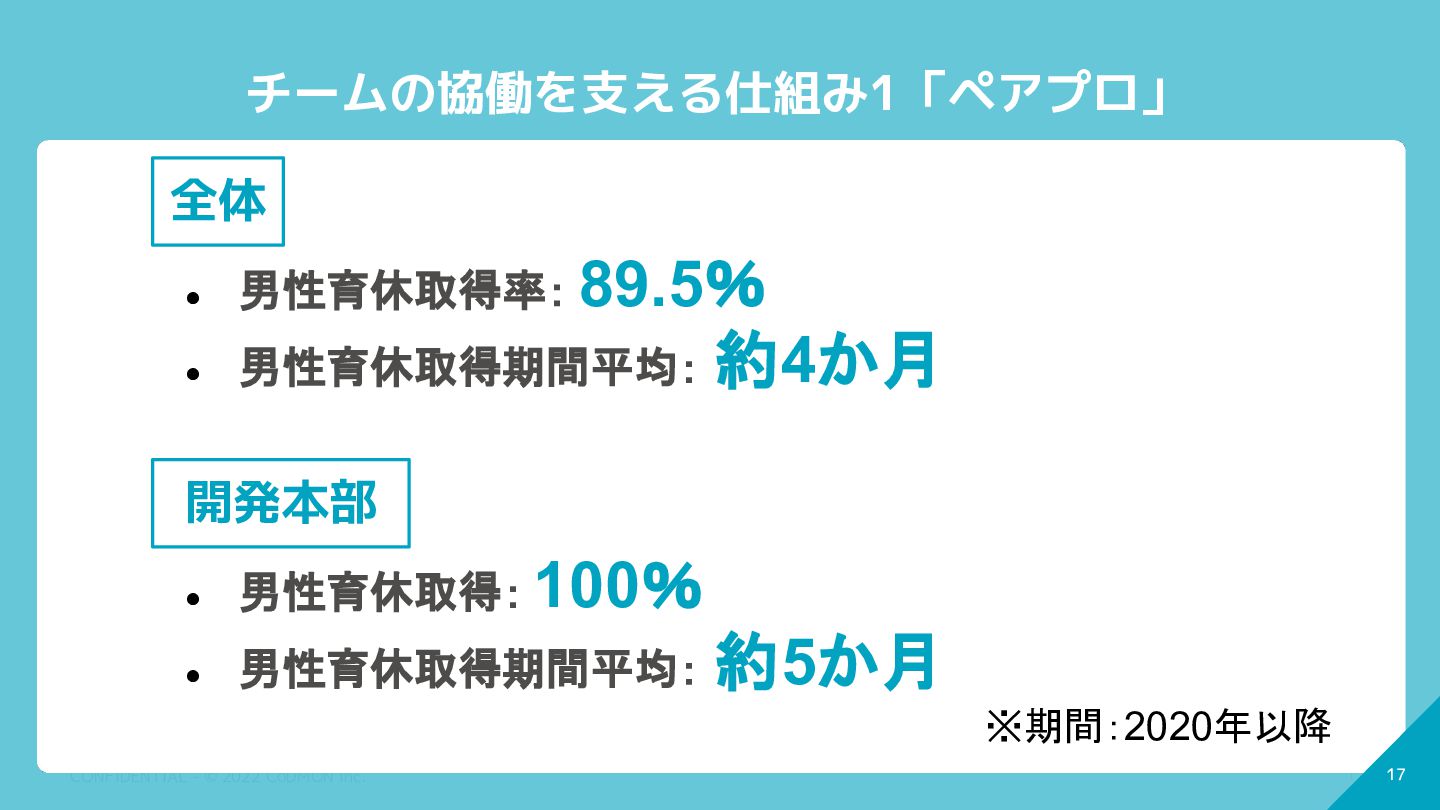 89.5% • 男性育休取得期間平均: 約4か月 チームの協働を支える仕組み1「ペアプロ」 ※期間:2020年以降 • 男性育休取得: 100% • 男性育休取得期間平均: 約5か月 全体 開発本部