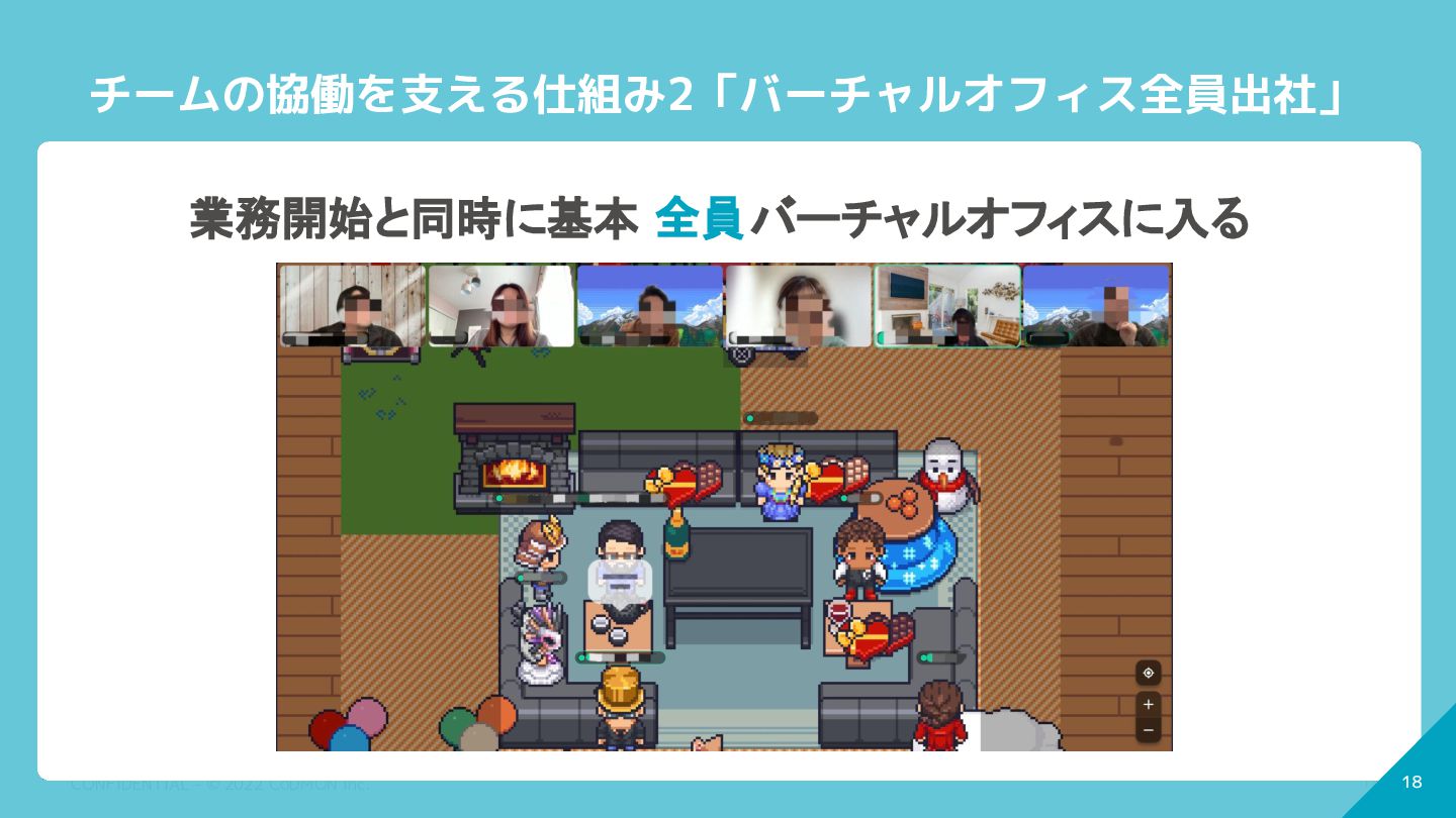 • 常に顔出し対面の安心感 ◦ リアルで会っても初めまして感がない ◦ たまに現れるお子さんや飼ってるペット達 • 出社組だけでいつの間にか話が進むこともない チームの協働を支える仕組み2「バーチャルオフィス全員出社」 リアル出社時と変わらない環境
