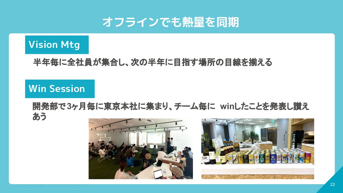 22 CONFIDENTIAL - © 2022 CoDMON Inc. 22 オフラインでも熱量を同期 開発部で3ヶ月毎に東京本社に集まり、チーム毎に