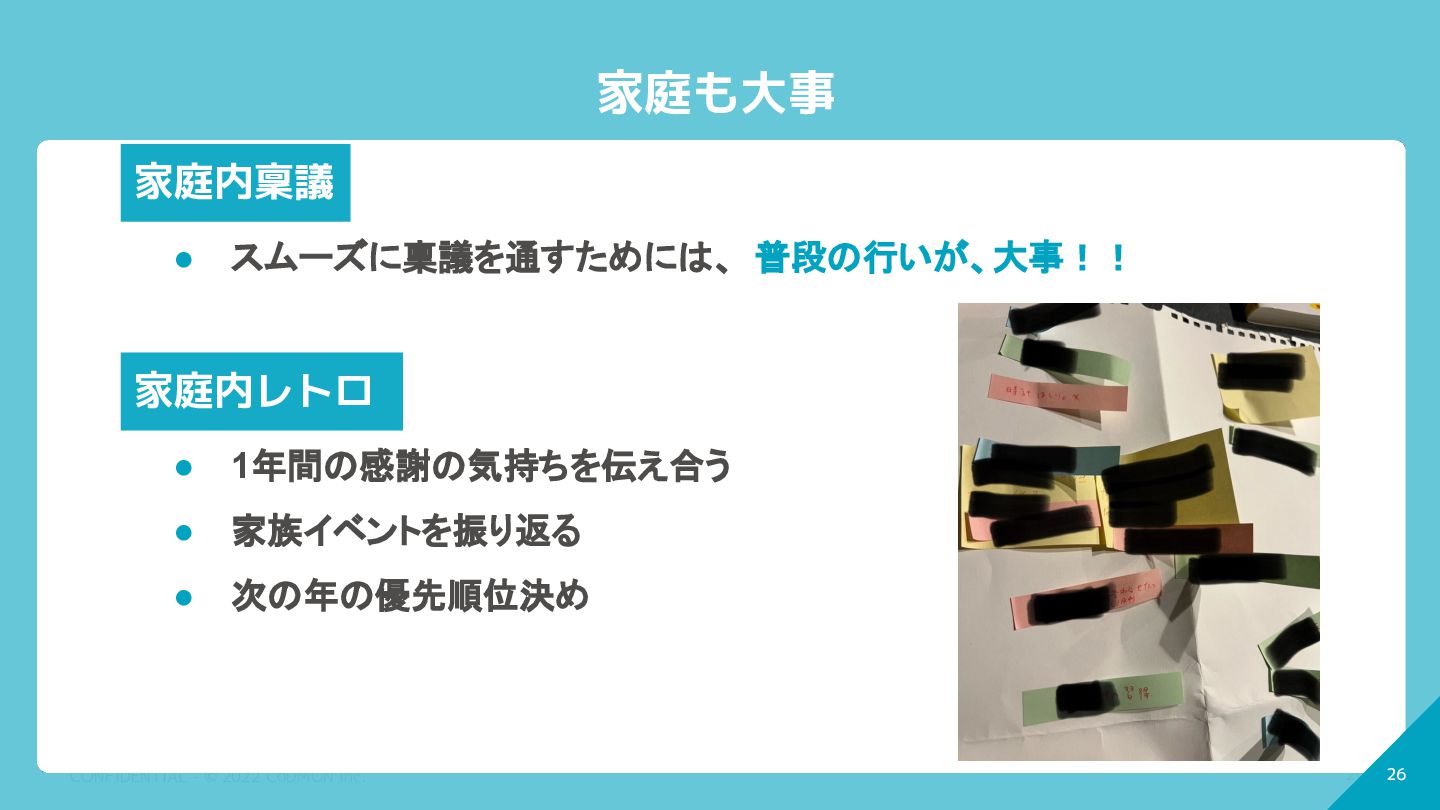スムーズに稟議を通すためには、 普段の行いが、大事!! 家庭内稟議 • 1年間の感謝の気持ちを伝え合う • 家族イベントを振り返る • 次の年の優先順位決め 家庭内レトロ