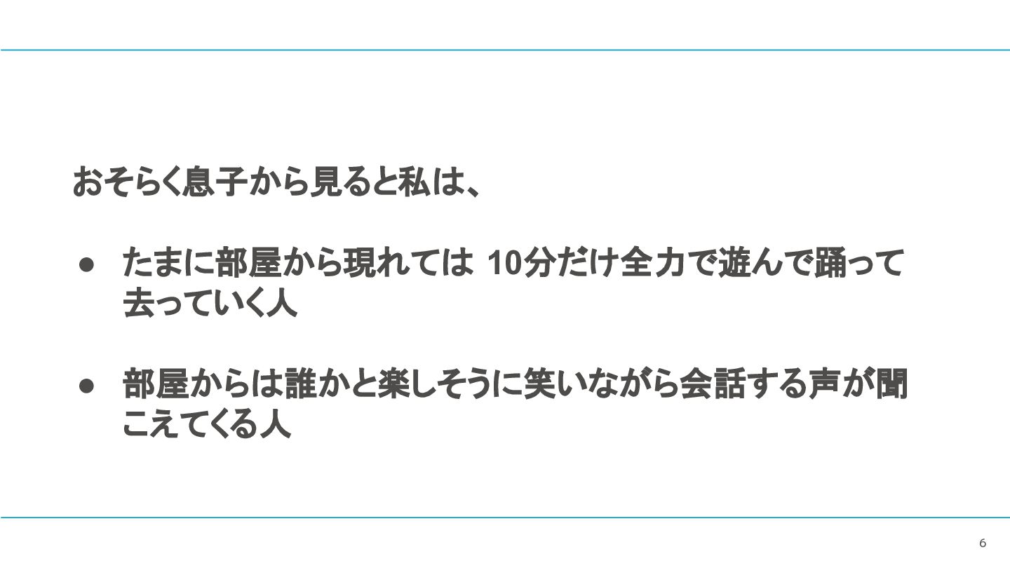 6 おそらく息子から見ると私は、 • たまに部屋から現れては 10分だけ全力で遊んで踊って 去っていく人 • 部屋からは誰かと楽しそうに笑いながら会話する声が聞 こえてくる人