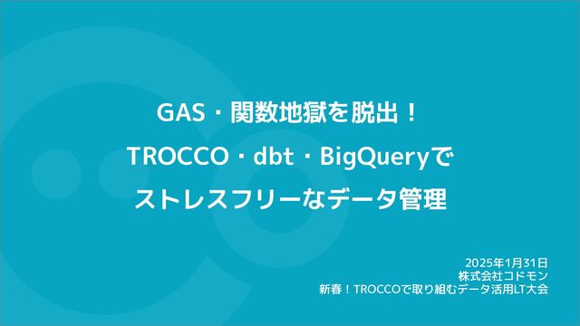 GAS・関数地獄を脱出! TROCCO・dbt・BigQueryで ストレスフリーなデータ管理 2025年1月31日 株式会社コドモン 新春!TROCCOで取り組むデータ活用LT大会
