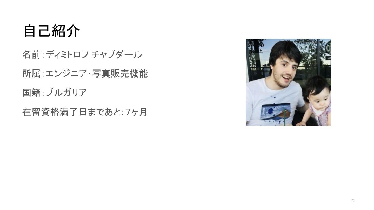 2 名前:ディミトロフ チャブダール 所属:エンジニア・写真販売機能 国籍:ブルガリア 在留資格満了日まであと:7ヶ月 自己紹介