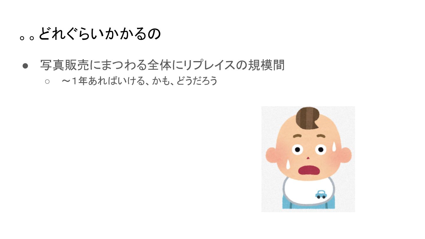 。。どれぐらいかかるの • 写真販売にまつわる全体にリプレイスの規模間 ◦ 〜1年あればいける、かも、どうだろう