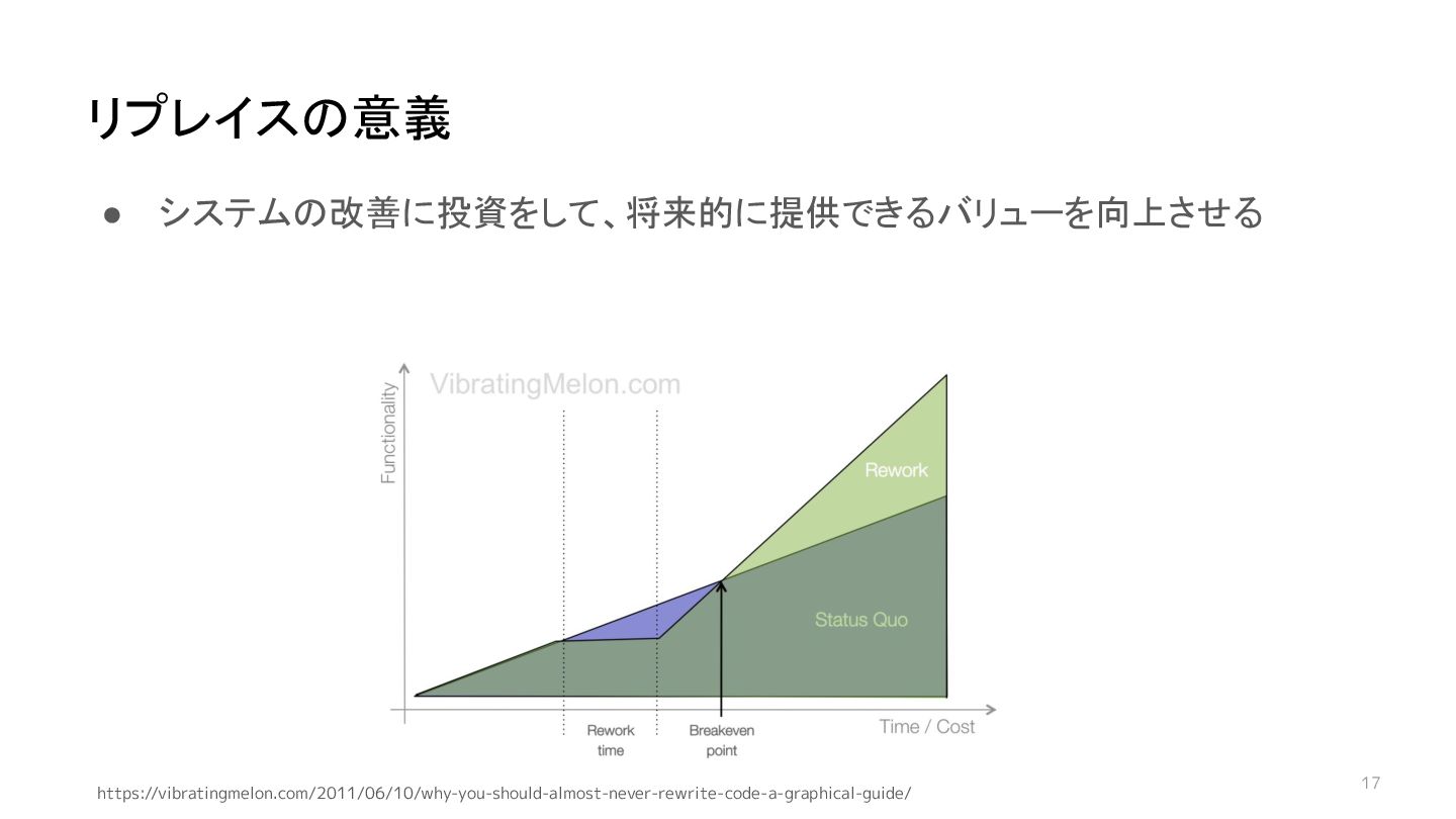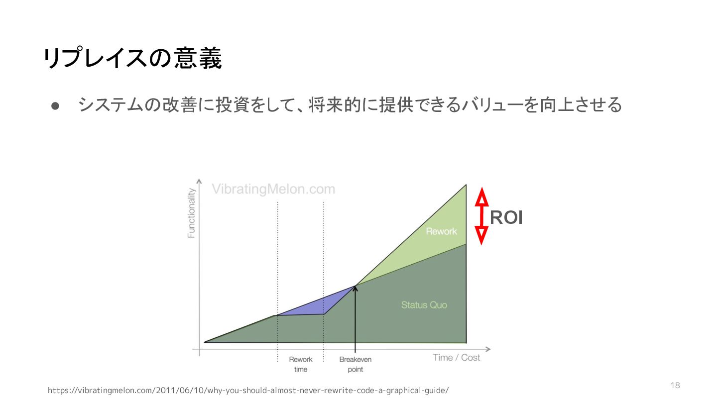 17 • システムの改善に投資をして、将来的に提供できるバリューを向上させる リプレイスの意義 https://vibratingmelon.com/2011/06/10/why-you-should-almost-never-rewrite-code-a-graphical-guide/