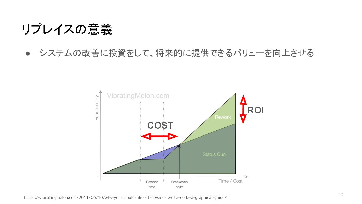 18 • システムの改善に投資をして、将来的に提供できるバリューを向上させる リプレイスの意義 https://vibratingmelon.com/2011/06/10/why-you-should-almost-never-rewrite-code-a-graphical-guide/ ROI