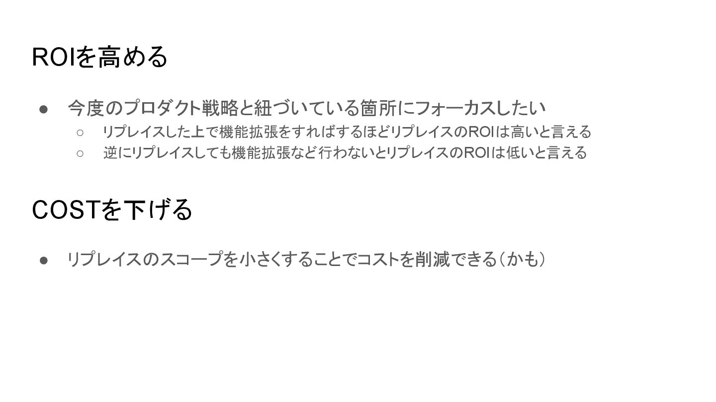 ROIを高める • 今度のプロダクト戦略と紐づいている箇所にフォーカスしたい ◦ リプレイスした上で機能拡張をすればするほどリプレイスのROIは高いと言える ◦ 逆にリプレイスしても機能拡張など行わないとリプレイスのROIは低いと言える COSTを下げる • リプレイスのスコープを小さくすることでコストを削減できる(かも)
