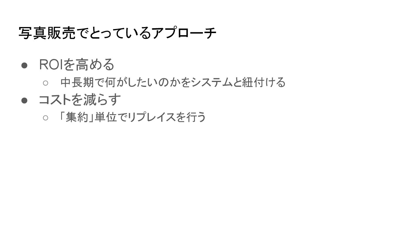 写真販売でとっているアプローチ • ROIを高める ◦ 中長期で何がしたいのかをシステムと紐付ける • コストを減らす ◦ 「集約」単位でリプレイスを行う