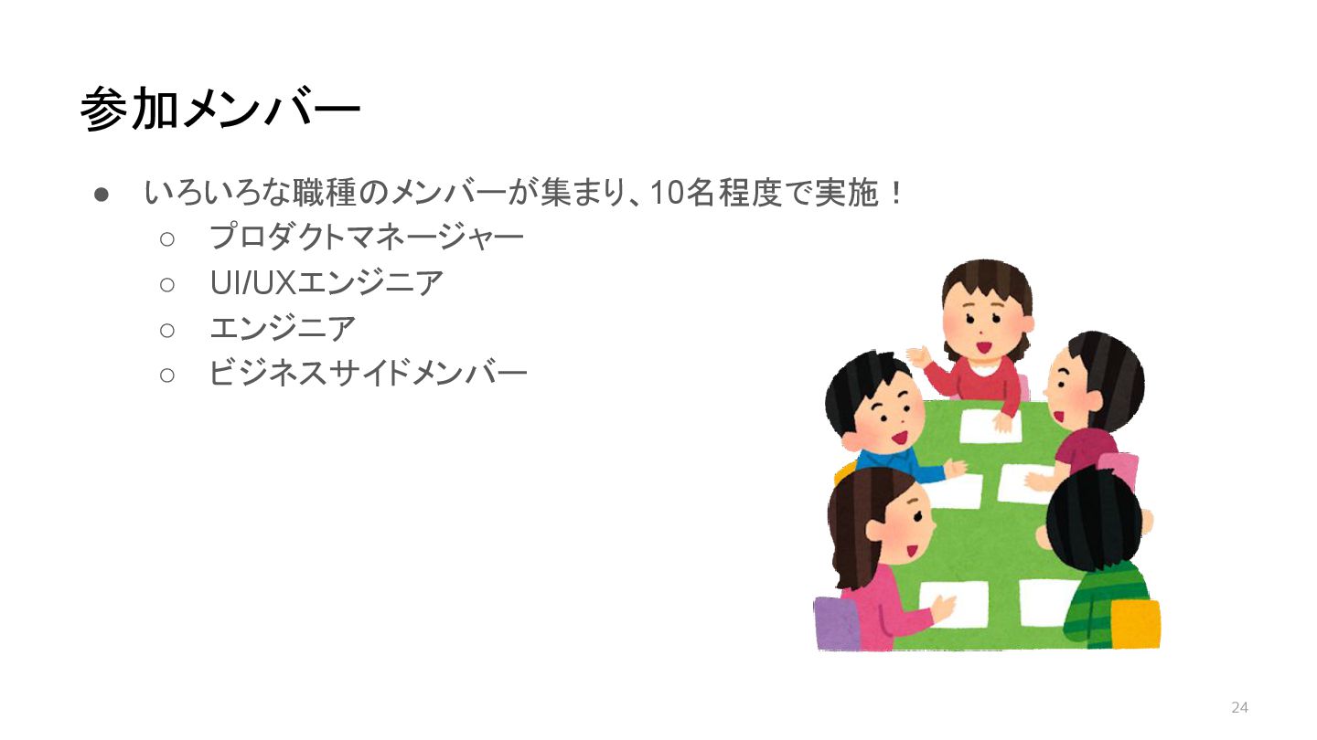 24 • いろいろな職種のメンバーが集まり、10名程度で実施! ◦ プロダクトマネージャー ◦ UI/UXエンジニア ◦ エンジニア ◦