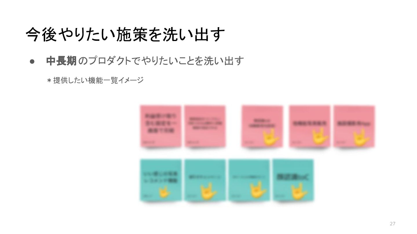 27 • 中長期のプロダクトでやりたいことを洗い出す *提供したい機能一覧イメージ 今後やりたい施策を洗い出す