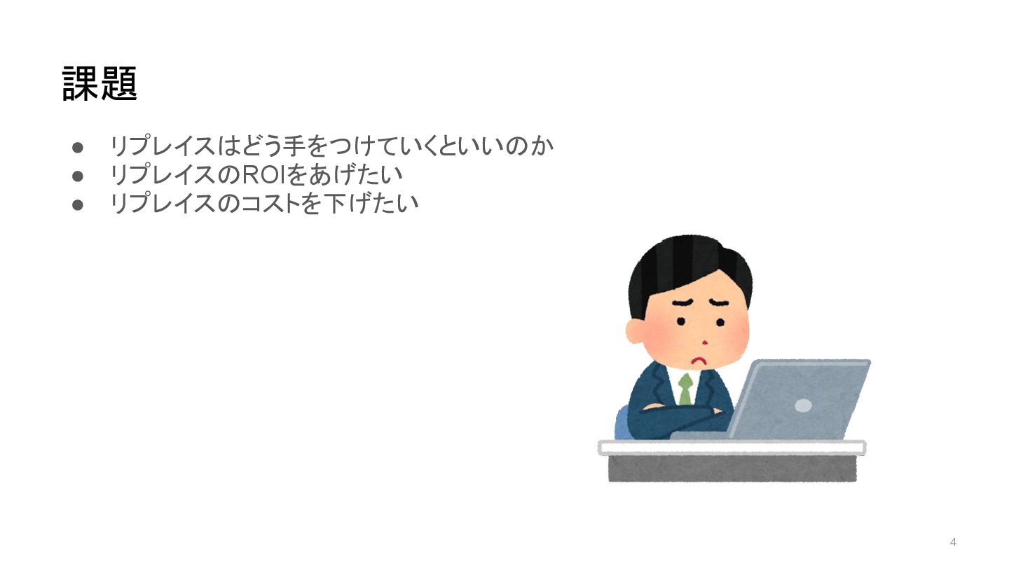 4 • リプレイスはどう手をつけていくといいのか • リプレイスのROIをあげたい • リプレイスのコストを下げたい 課題