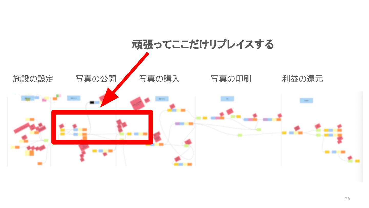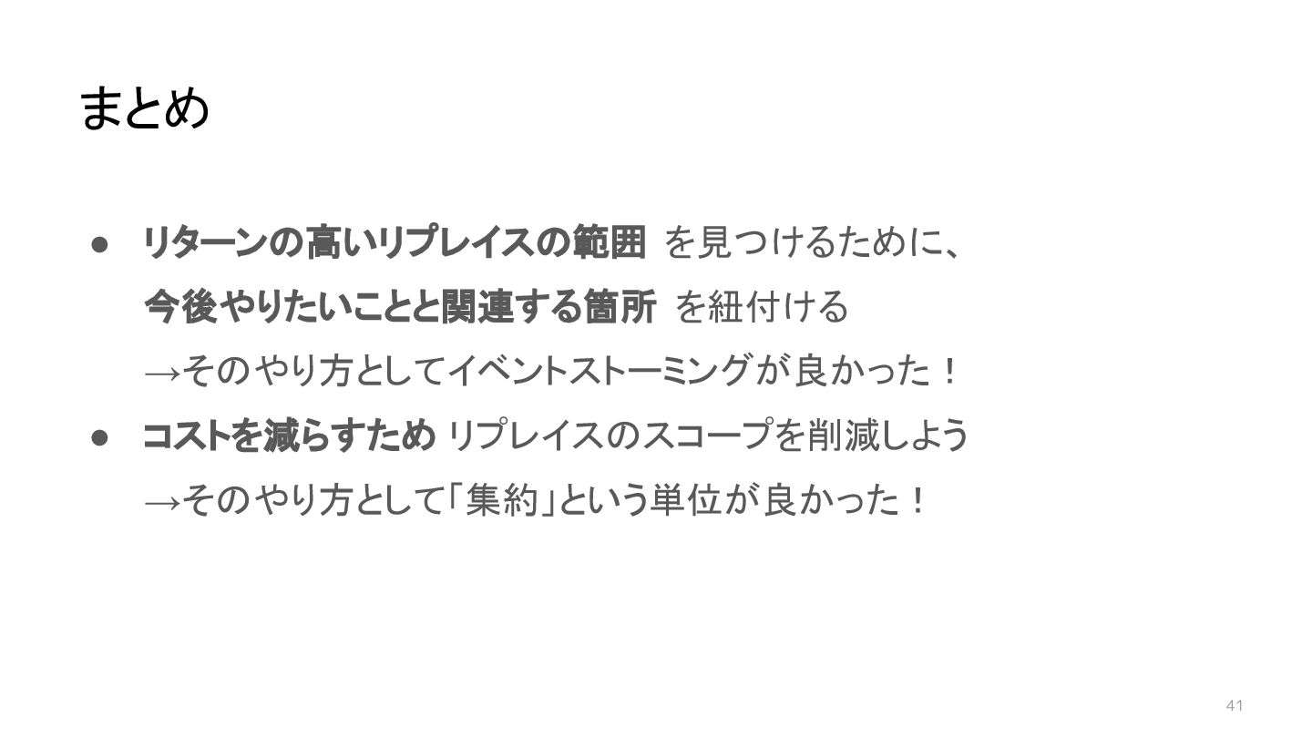 41 • リターンの高いリプレイスの範囲 を見つけるために、 今後やりたいことと関連する箇所 を紐付ける →そのやり方としてイベントストーミングが良かった! • コストを減らすため リプレイスのスコープを削減しよう