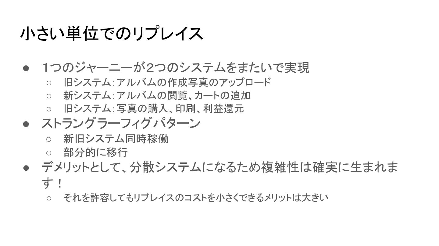 ◦ 新旧システム同時稼働 ◦ 部分的に移行 • デメリットとして、分散システムになるため複雑性は確実に生まれま す! ◦ それを許容してもリプレイスのコストを小さくできるメリットは大きい 小さい単位でのリプレイス
