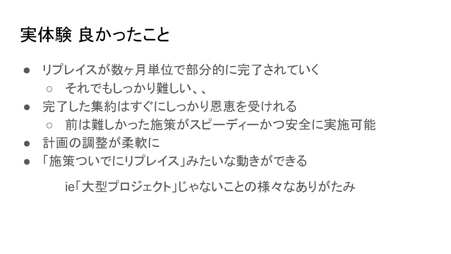 • 「施策ついでにリプレイス」みたいな動きができる ie「大型プロジェクト」じゃないことの様々なありがたみ 実体験 良かったこと