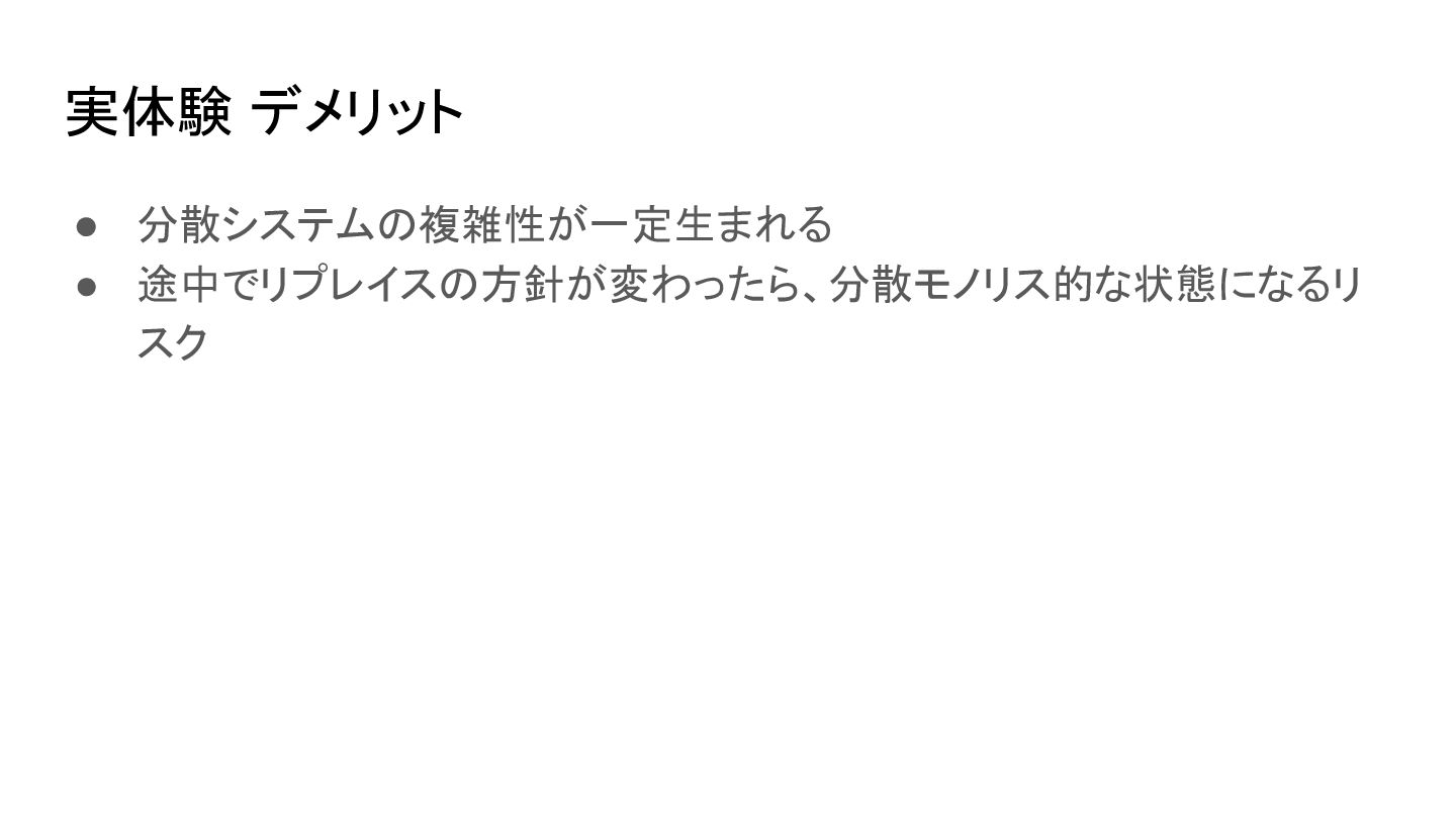 • 分散システムの複雑性が一定生まれる • 途中でリプレイスの方針が変わったら、分散モノリス的な状態になるリ スク 実体験 デメリット