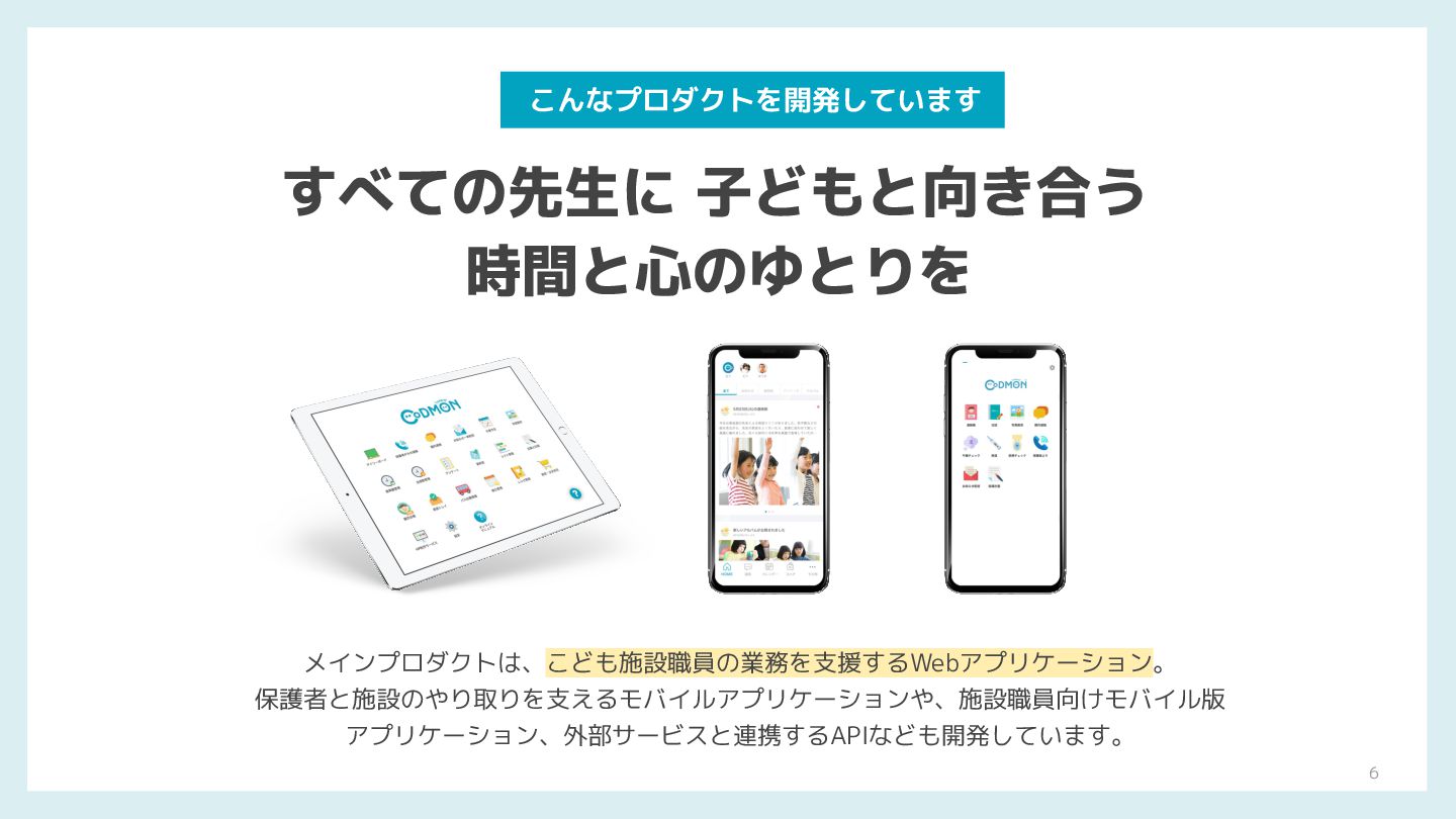 すべての先生に 子どもと向き合う 時間と心のゆとりを こんなプロダクトを開発しています メインプロダクトは、こども施設職員の業務を支援するWebアプリケーション。 保護者と施設のやり取りを支えるモバイルアプリケーションや、施設職員向けモバイル版 アプリケーション、外部サービスと連携するAPIなども開発しています。 6