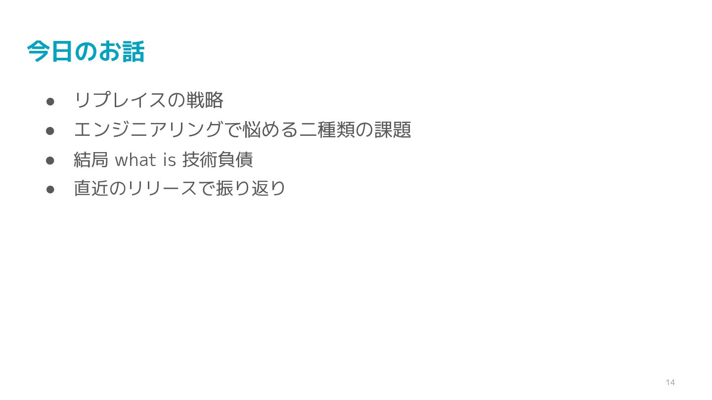 14 • リプレイスの戦略 • エンジニアリングで悩める二種類の課題 • 結局 what is 技術負債