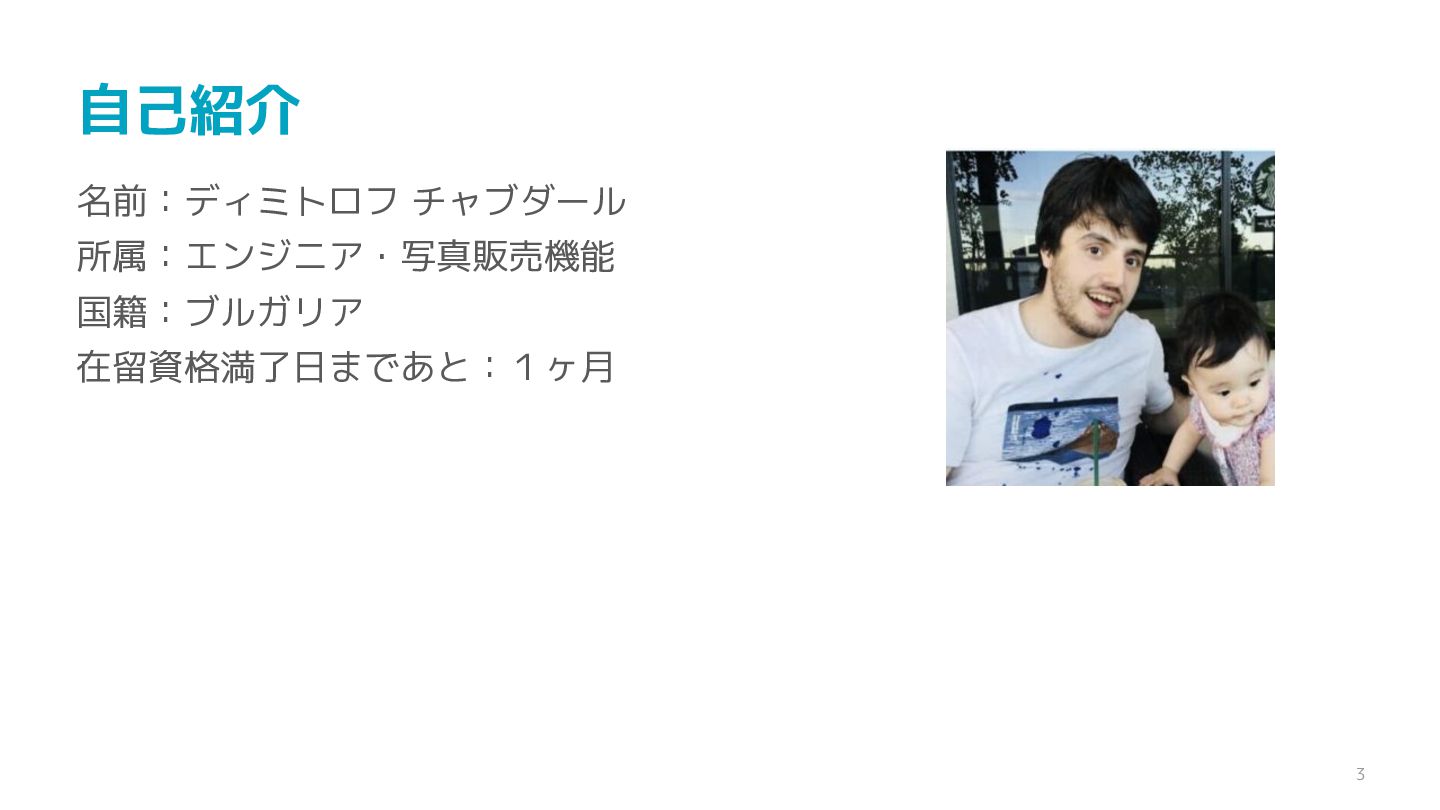 3 名前:ディミトロフ チャブダール 所属:エンジニア・写真販売機能 国籍:ブルガリア 在留資格満了日まであと:1ヶ月 自己紹介
