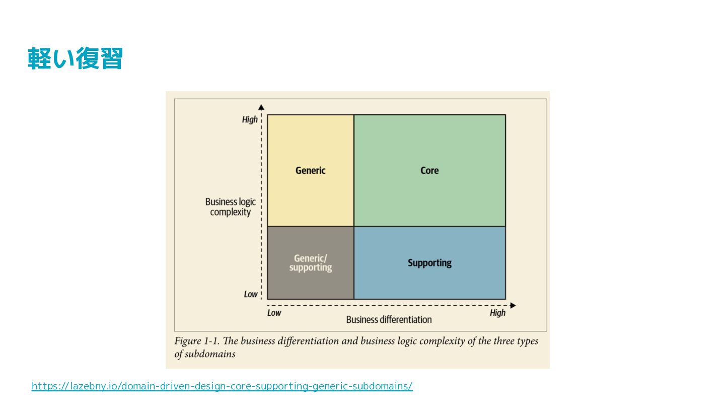 軽い復習 複雑な割には競合優位 性あまり影響ない =非コア https://lazebny.io/domain-driven-design-core-supporting-generic-subdomains/