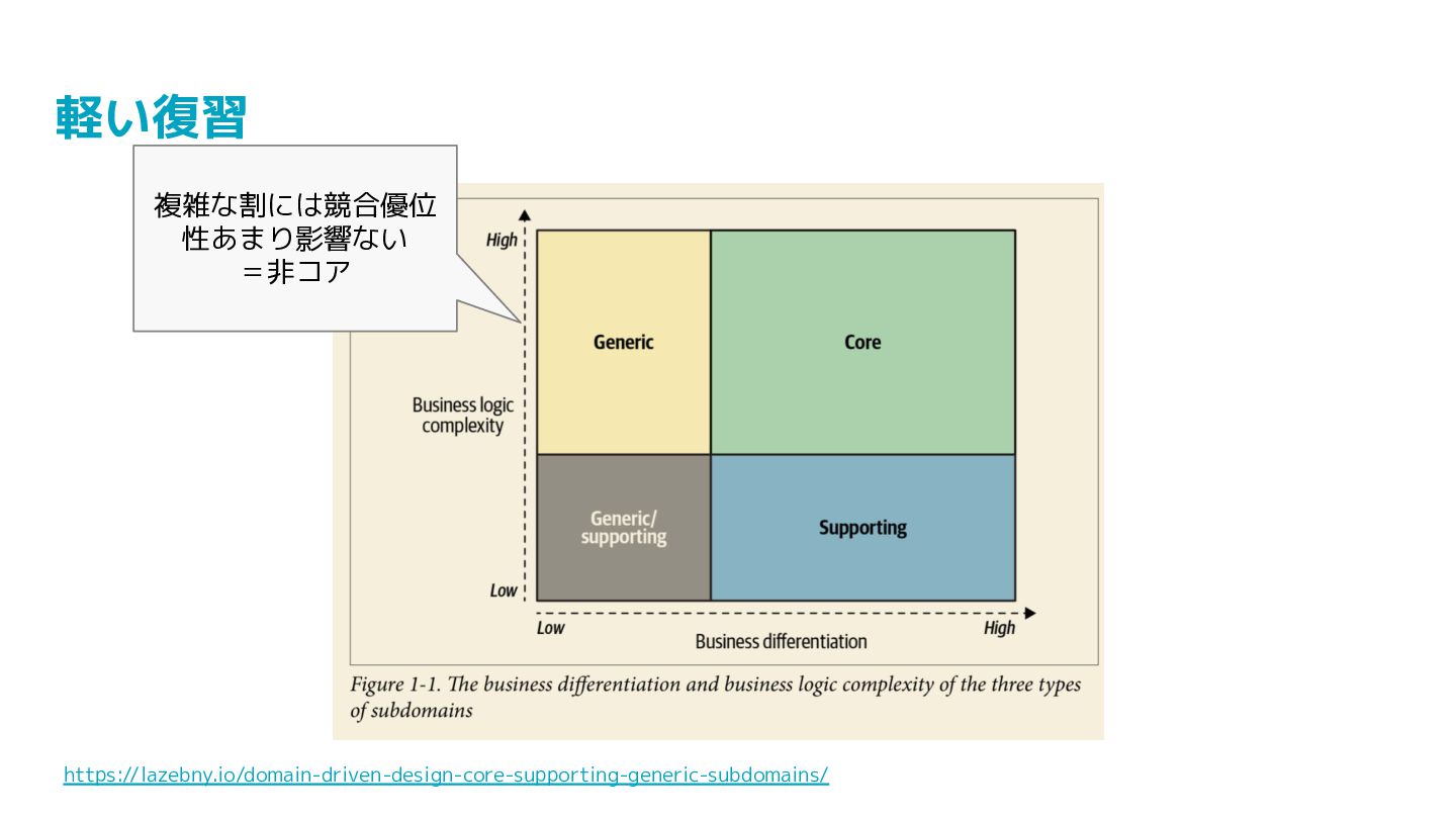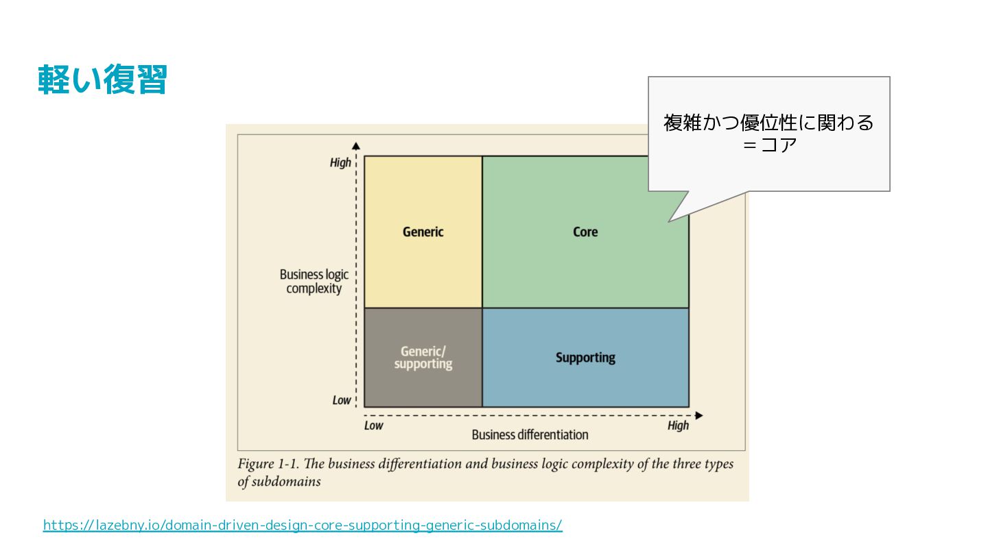 軽い復習 複雑かつ優位性に関わる =コア https://lazebny.io/domain-driven-design-core-supporting-generic-subdomains/