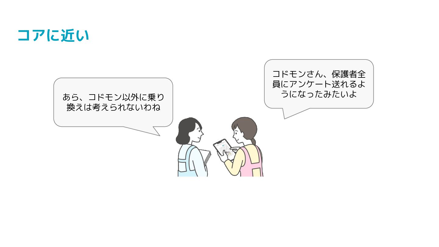 コアに近い コドモンさん、保護者全 員にアンケート送れるよ うになったみたいよ あら、コドモン以外に乗り 換えは考えられないわね