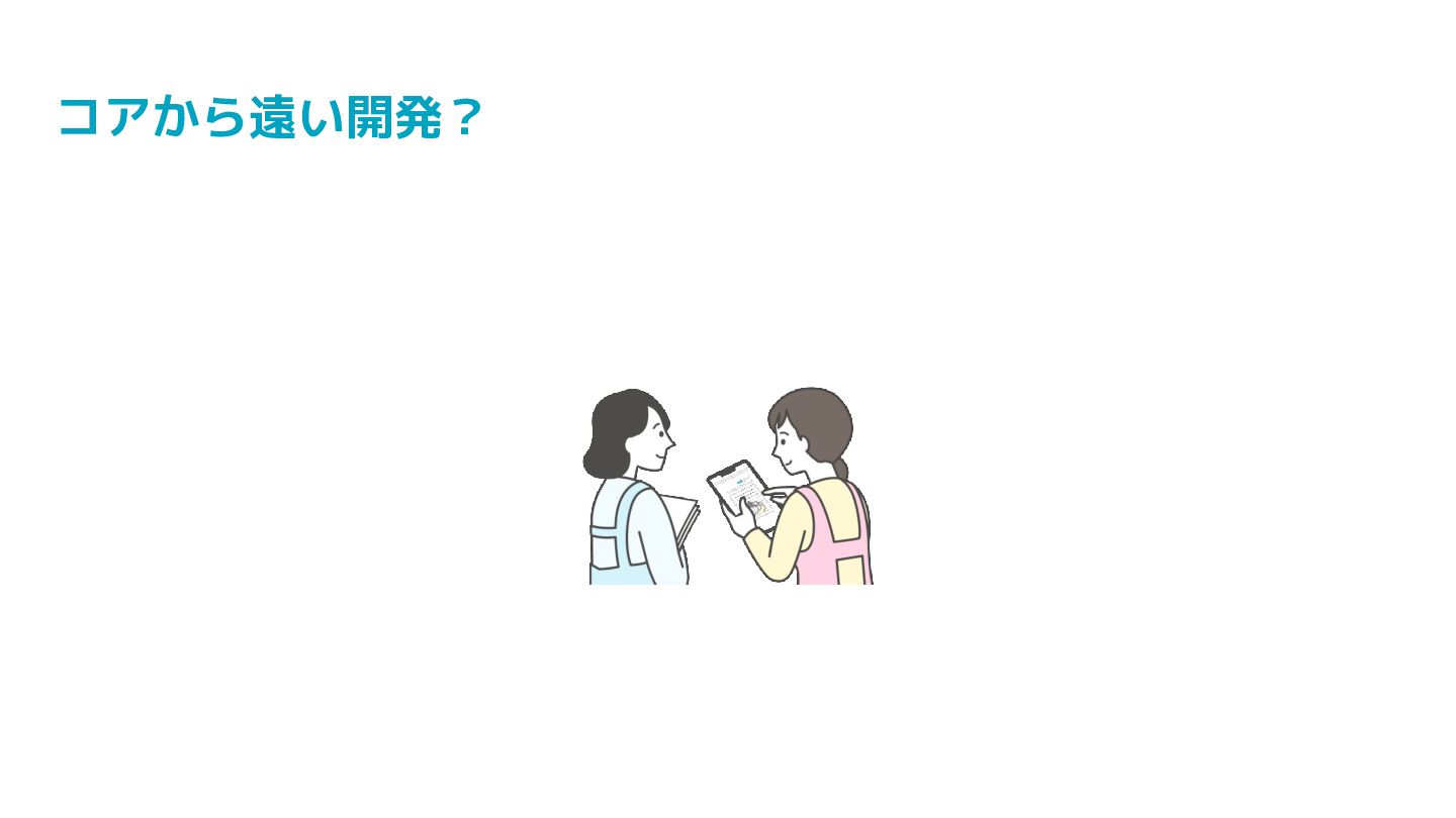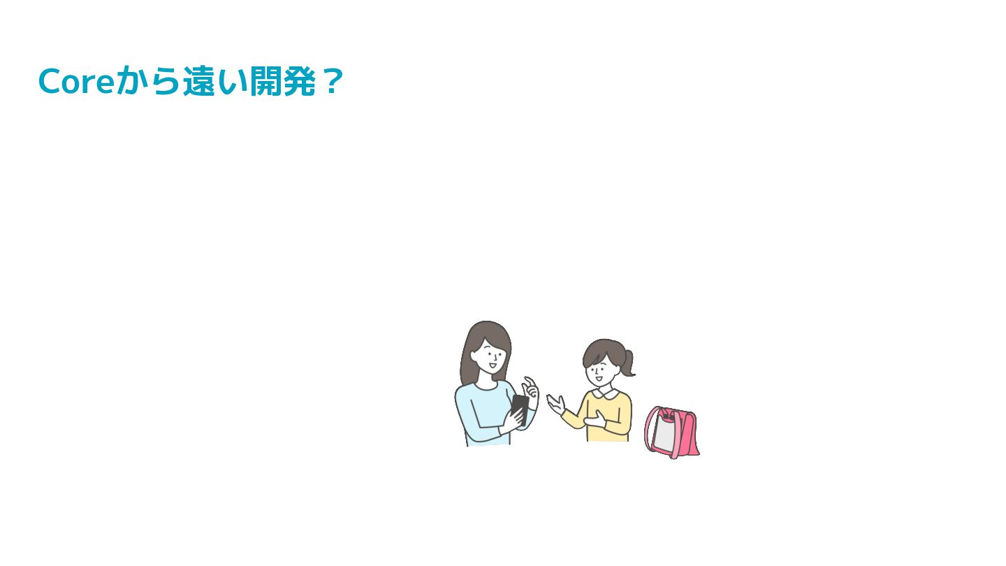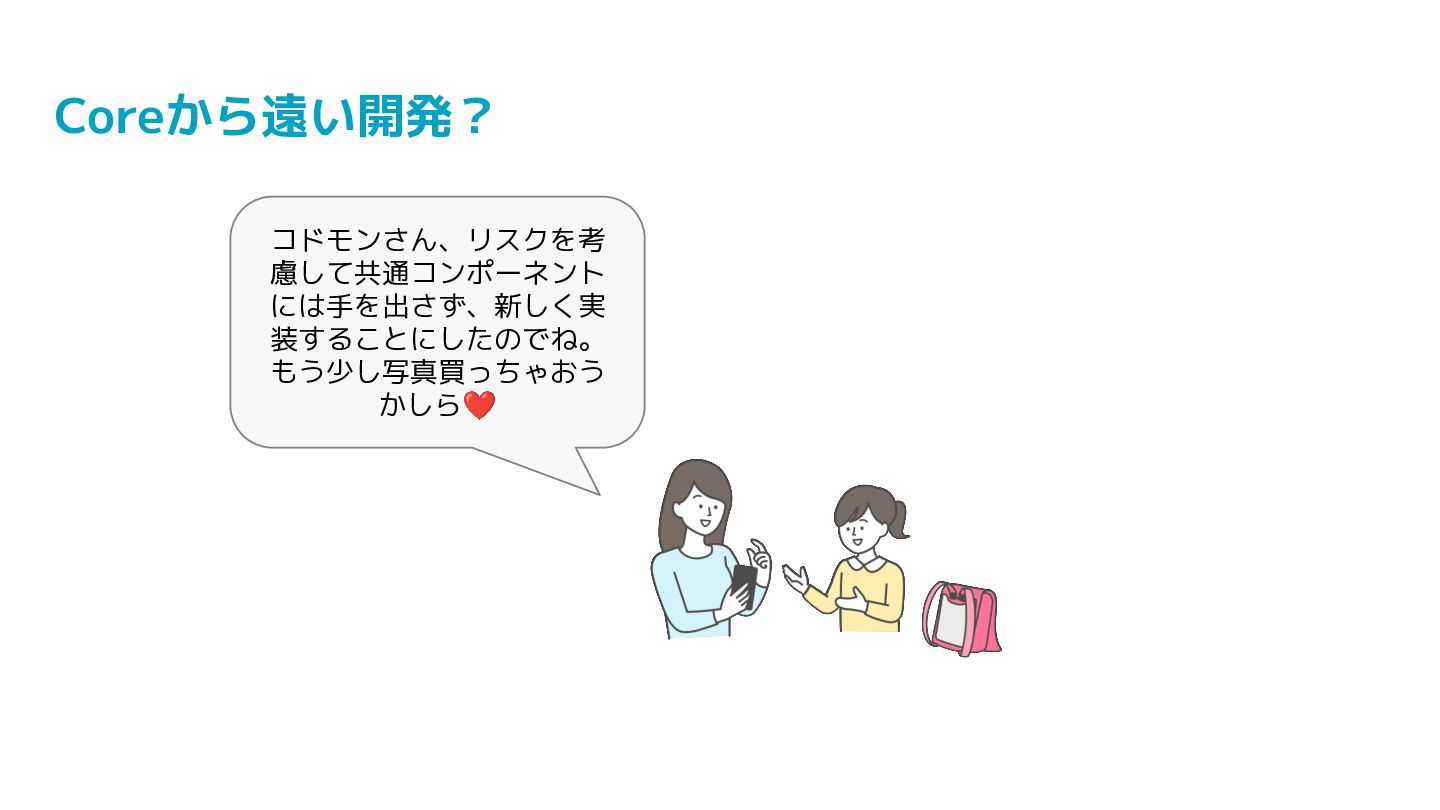 Coreから遠い開発? コドモンさん、リスクを考 慮して共通コンポーネント には手を出さず、新しく実 装することにしたのでね。 もう少し写真買っちゃおう かしら❤