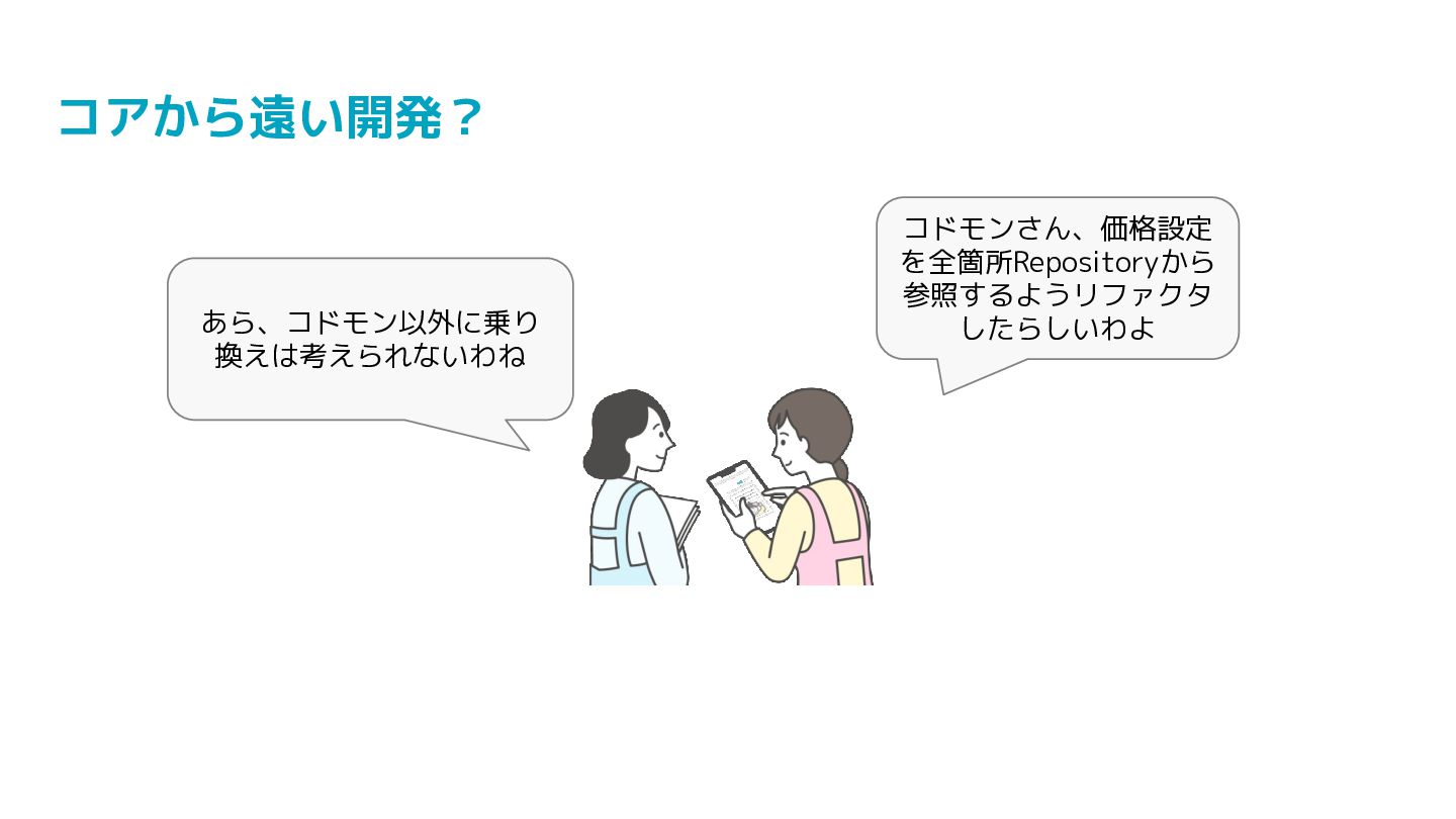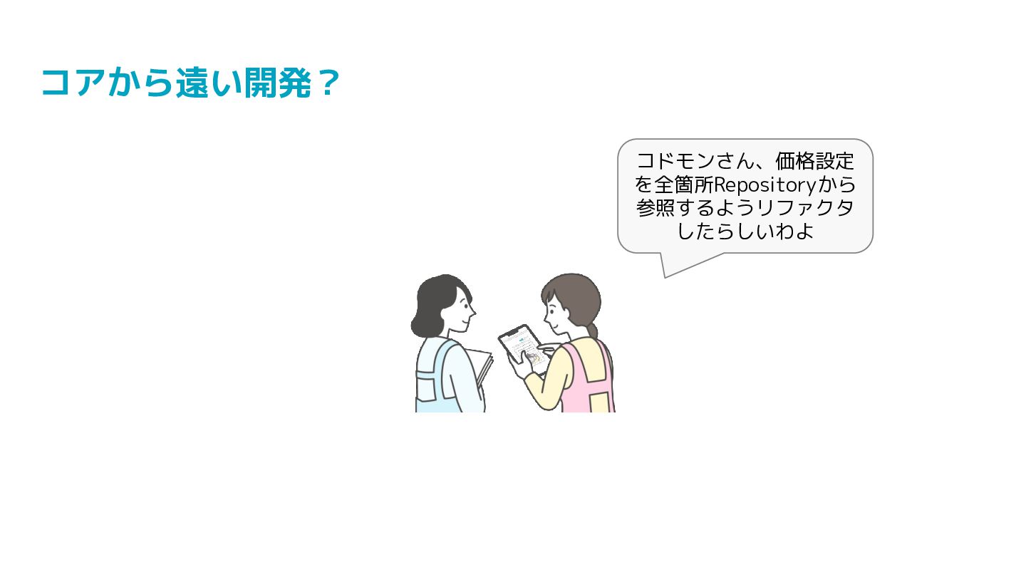 コアから遠い開発? コドモンさん、価格設定 を全箇所Repositoryから 参照するようリファクタ したらしいわよ あら、コドモン以外に乗り 換えは考えられないわね