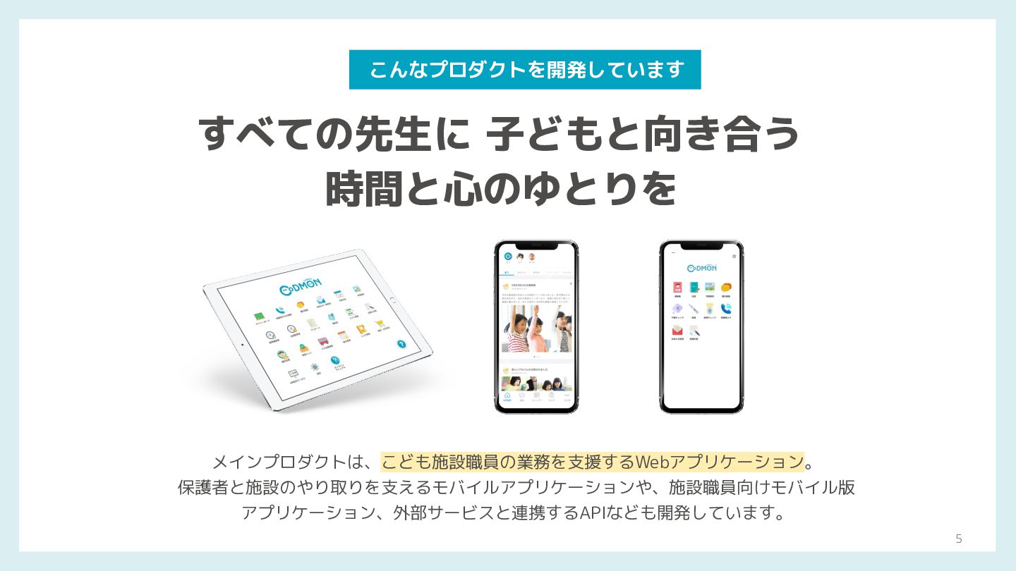 すべての先生に 子どもと向き合う 時間と心のゆとりを こんなプロダクトを開発しています メインプロダクトは、こども施設職員の業務を支援するWebアプリケーション。 保護者と施設のやり取りを支えるモバイルアプリケーションや、施設職員向けモバイル版 アプリケーション、外部サービスと連携するAPIなども開発しています。 5
